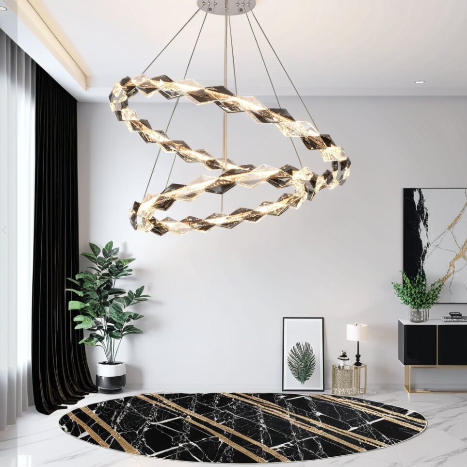 اضاءة معلقة مودرن أنيقة بتصميم فاخر مكون من حلقتين متداخلتين مزينتين بالكريستال البراق لتعكس إضاءة دافئة وجذابة بدرجة حرارة 3000 كلفن. بأقطار 80 سم و60 سم وارتفاع تعليق يصل إلى 150 سم، تعتبر خيارًا مثاليًا لمن يبحث عن قطعة إضاءة تجمع بين الفخامة والعصرية، لتزيين غرف المعيشة، الصالات، أو غرف الطعام بإطلالة ساحرة تخطف الأنظار.