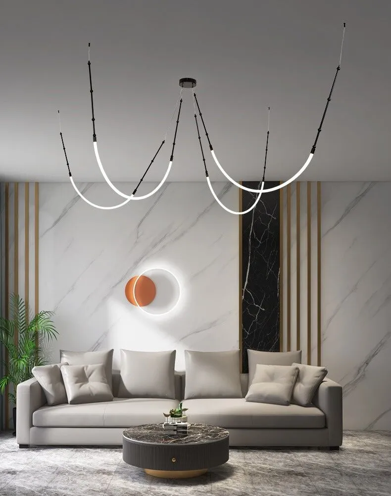 اضاءة معلقة مودرن تتميز بتصميم فريد وأنيق يتألف من عدة خطوط إنارة مرنة وموزعة بشكل فني لتناسب المساحات الواسعة. مصنوعة من مواد عالية الجودة ، مع غطاء ناعم يوفر إضاءة دافئة وموحدة بدرجة حرارة لون تبلغ 3000 كلفن. تعمل بقدرة 24 واط وتوفر كفاءة إضاءة تصل إلى 1920 لومن، مما يجعلها مثالية لغرف المعيشة، غرف النوم، وغرف الطعام. يبلغ عرضها 230 سم، ما يجعلها قطعة فنية تضفي جمالاً وجاذبية على المكان. تصنيف IP20 يجعلها مناسبة للاستخدام الداخلي.