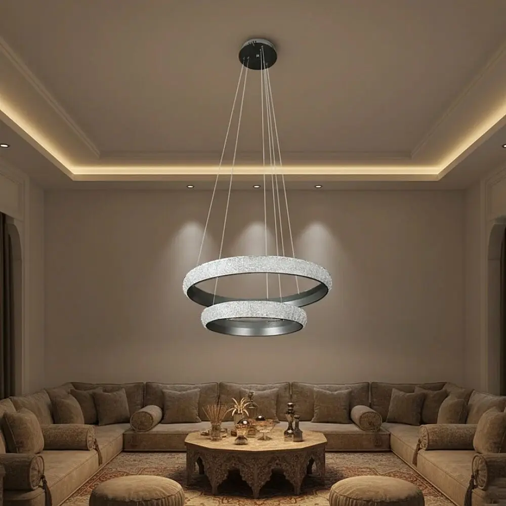 ثريا مودرن بتفاصيل معدنية تمنح الغرفة لمعانًا خفيفًا تألق في كل مناسبة مع هذه الاضاءة تضفي أجواءً من الرقي والبهاء
