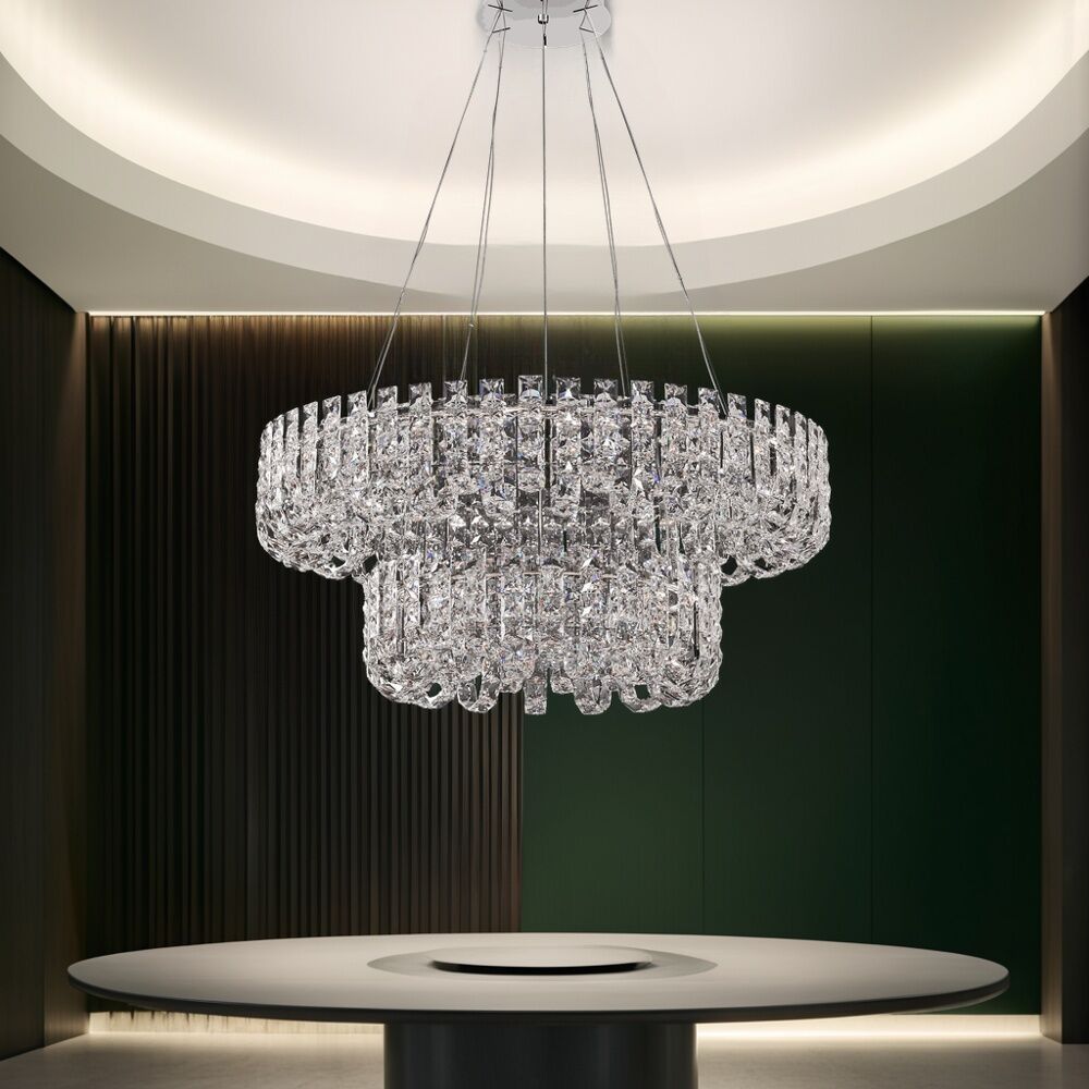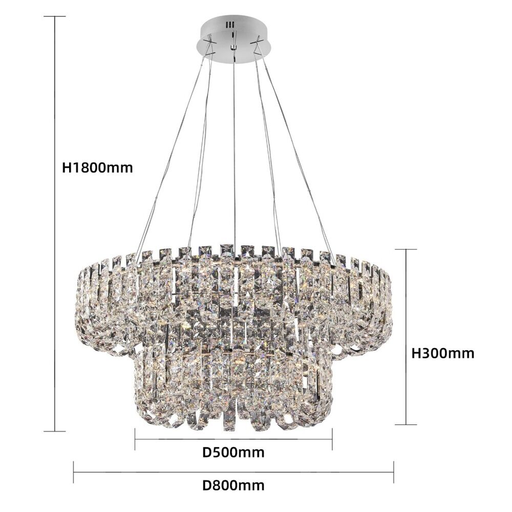 ثريا كريستالية مذهلة بطبقتين فاخرتين، مصممة لإضفاء لمسة من الفخامة والأناقة في المساحات الداخلية الراقية. تأتي بهيكل متين مصنوع من الفولاذ المقاوم للصدأ مع كريستالات مقطوعة بدقة فائقة لتعكس الضوء بأسلوب ساحر. تتميز بمقاسين متناسقين، حيث يبلغ قطر الطبقة العلوية 80 سم والطبقة السفلية 50 سم، بارتفاع إجمالي يصل إلى 180 سم. تعمل بإضاءة LED بقوة 100 واط، مع درجة حرارة لون 3000K، مما يوفر إضاءة دافئة ومريحة تعزز أجواء المكان. بلون الكروم الفضي الأنيق، تضيف هذه الثريا لمسة من الفخامة والرقي للمجالس، المطاعم، والبارات، حيث تجمع بين التصميم العصري واللمسات الكلاسيكية لتناسب مختلف أنماط الديكور الداخلي.