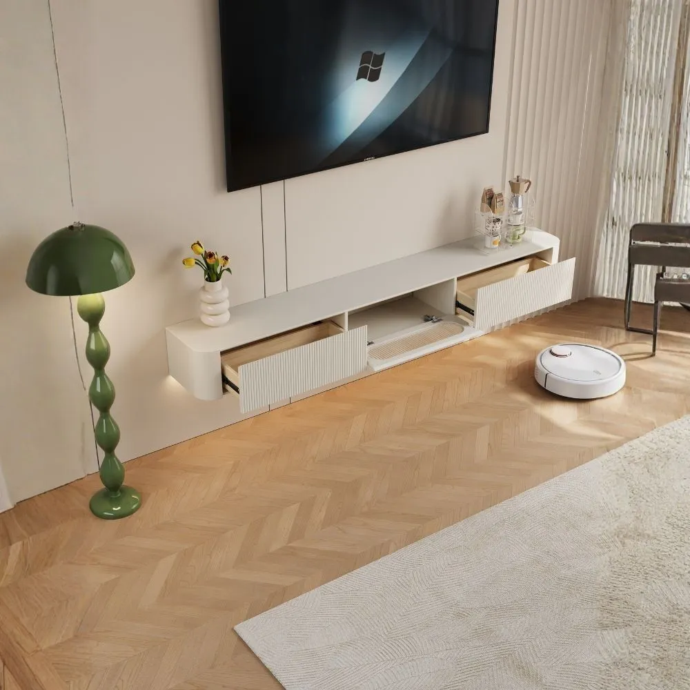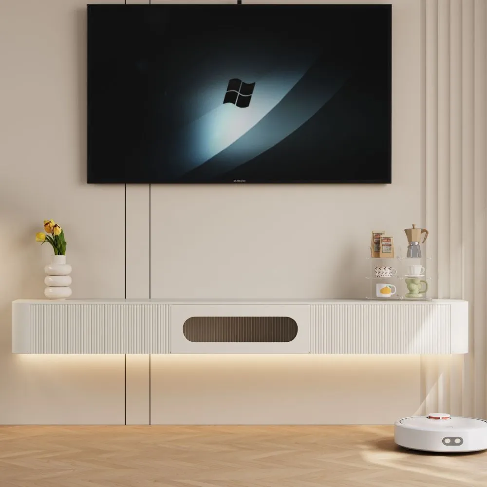 حامل التلفزيون الجداري بتصميم عصري وأنيق، مصنوع من خشب صلب عالي الجودة مع تشطيب كريمي ناعم يضيف لمسة من الرقي لأي مساحة. يتميز الحامل بتصميمه المدمج الذي يساهم في توفير المساحة. يتمتع الحامل بمتانة استثنائية مع الحفاظ على البساطة في التفاصيل، مما يجعله خيارًا مثاليًا للمساحات الحديثة.