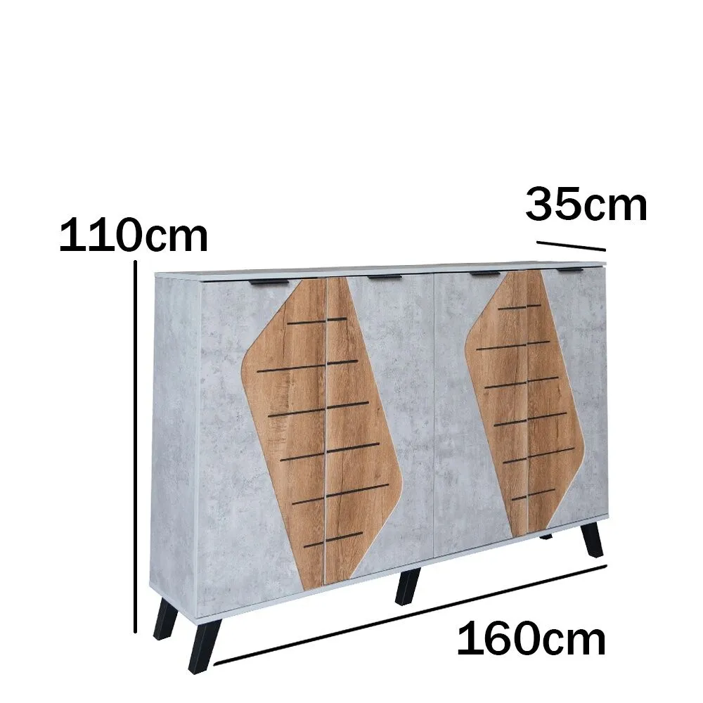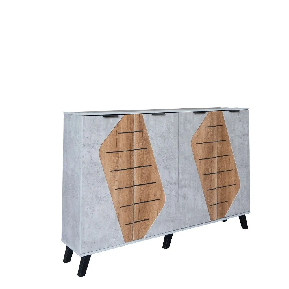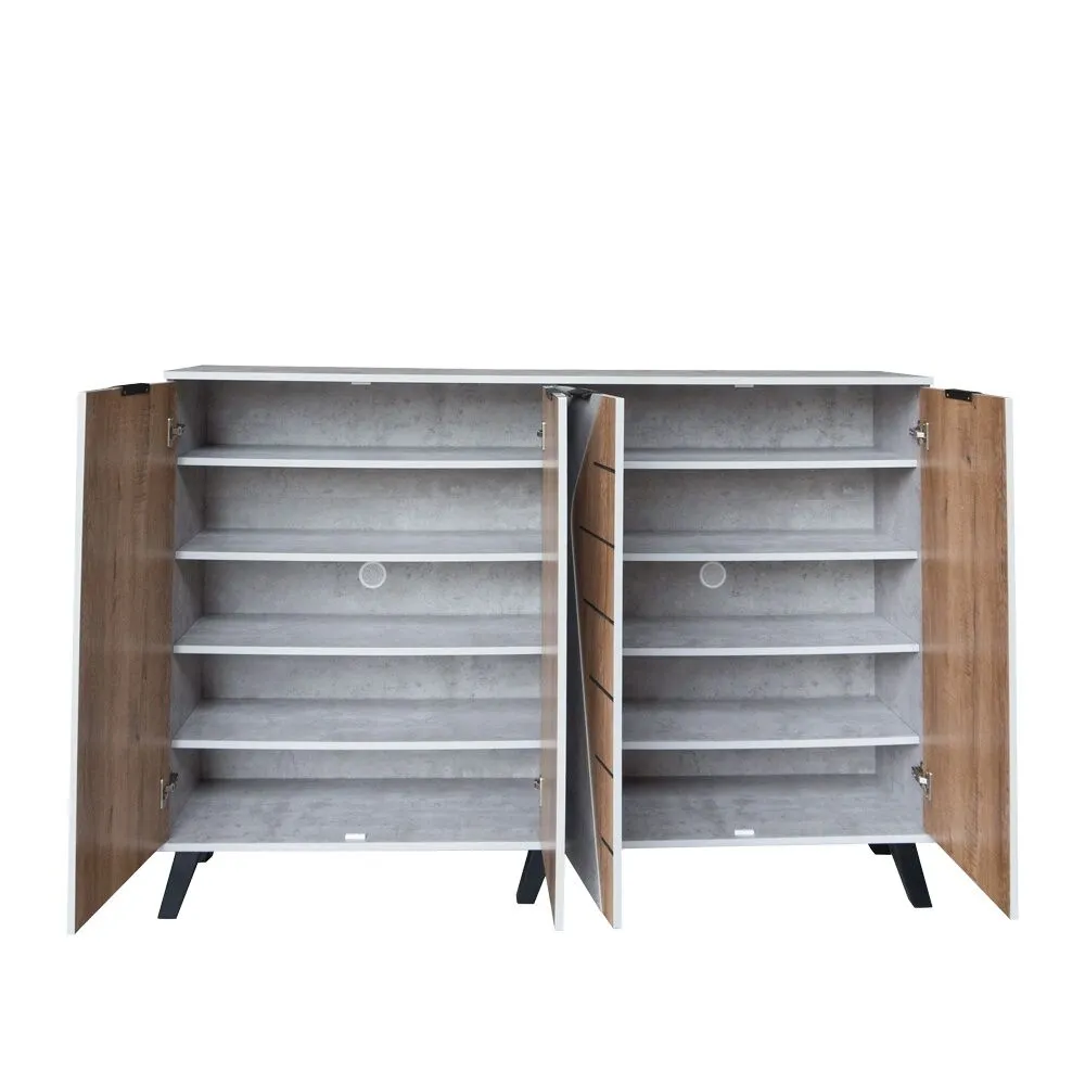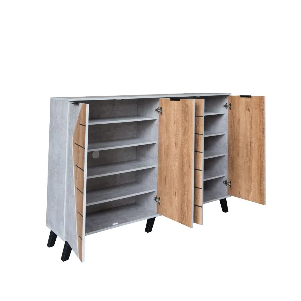 تحتوي خزانة الأحذية على عدة رفوف مغلقة بأبواب، مما يساعد في ترتيب الأحذية بشكل أنيق وسهل الوصول إليها.