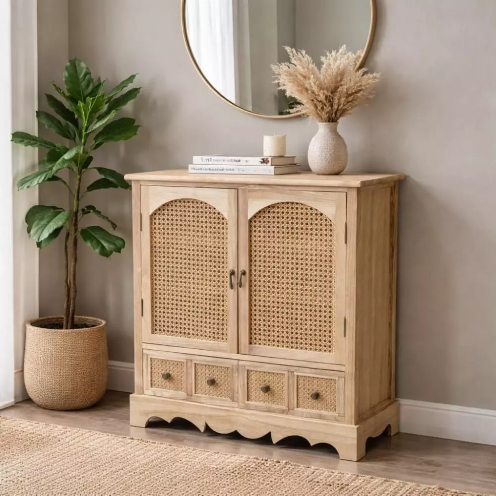 خزانة جانبية كاندريان : صغير بتصميم أنيق يجمع بين الخشب والراتان ليمنح أي مساحة داخل المنزل لمسة طبيعية دافئة وإحساسًا بالبساطة الراقية. يتميز بحجمه العملي المناسب للمساحات الصغيرة مع حضور جمالي ينسجم بسهولة مع مختلف أنماط الديكور. يوفر مساحة منظمة لتخزين الأغراض أو عرض القطع الديكورية بشكل مرتب وأنيق، ويمكن استخدامه في المداخل أو غرف المعيشة أو الزوايا الجانبية لإضافة طابع هادئ ومتناغم يعكس جمال التفاصيل الطبيعية في التصميم.