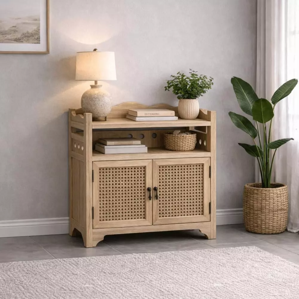 خزانة جانبية كاندري : صغير بتصميم أنيق يجمع بين الخشب والراتان ليمنح أي مساحة داخل المنزل لمسة دافئة وطبيعية. يتميز بحجمه العملي الذي يجعله مناسبًا للأماكن الصغيرة، مع مظهر جمالي ينسجم بسهولة مع مختلف أنماط الديكور سواء الريفي أو العصري. يوفر مساحة مناسبة لترتيب الأغراض اليومية أو عرض القطع الديكورية بشكل منظم وأنيق، كما يمكن استخدامه في المداخل أو غرف المعيشة أو الزوايا الجانبية لإضافة إحساس بالراحة والبساطة مع لمسة طبيعية جذابة.
