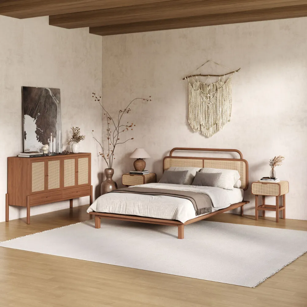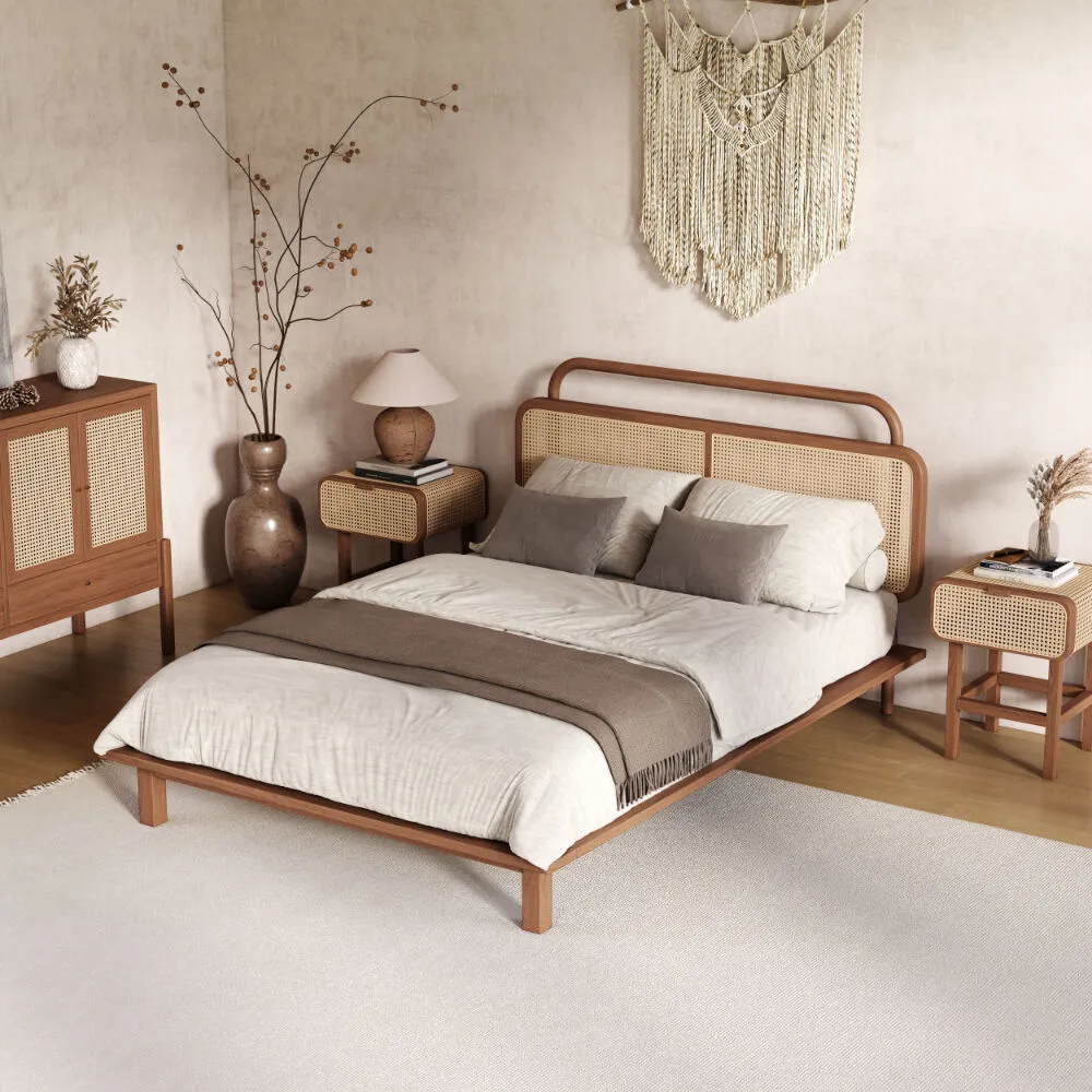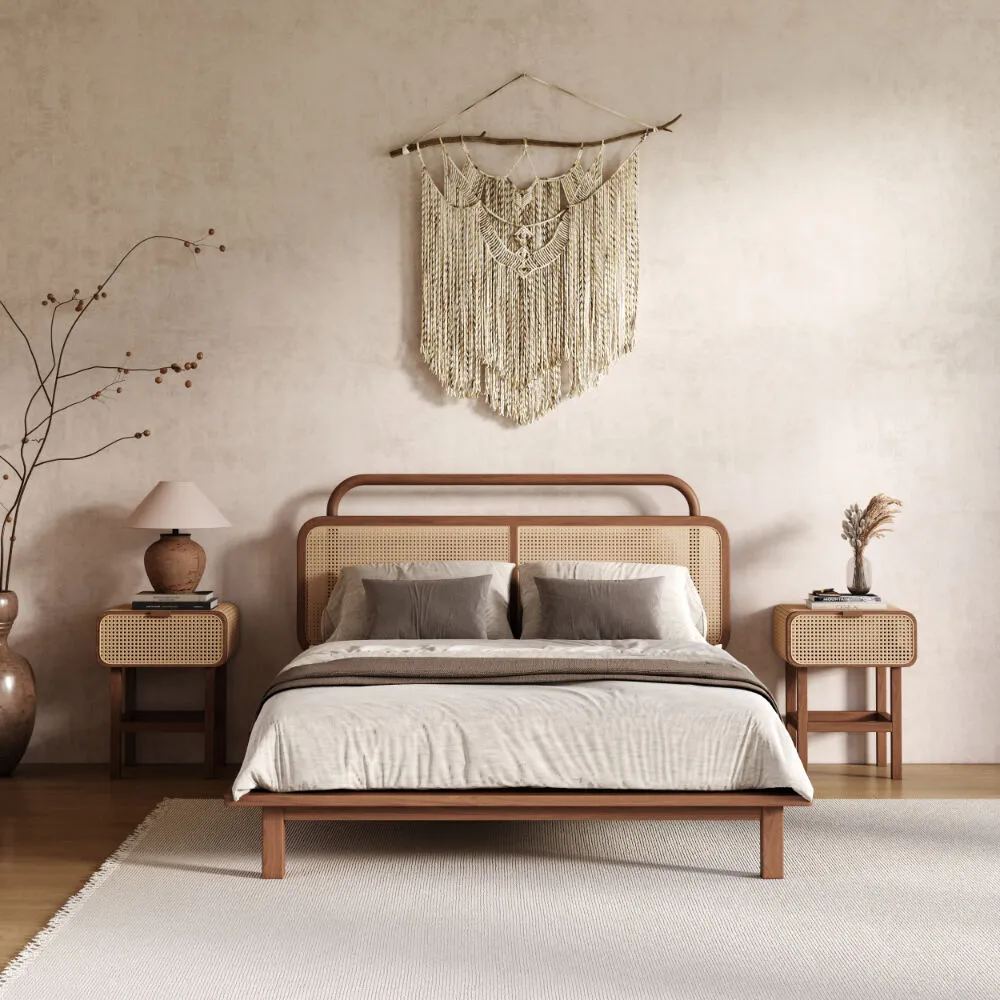 ارتقِ بأجواء غرفة نومك مع هذا السرير الخشبي الفاخر المصمم بأسلوب عصري مستوحى من الطراز الاسكندنافي. يتميز بإطار خشبي متين باللون البني الطبيعي، مع لوح رأس من الراتان يمنحك لمسة دافئة وأناقة خالدة. تصميم مثالي لعشّاق البساطة الراقية والمواد الطبيعية.