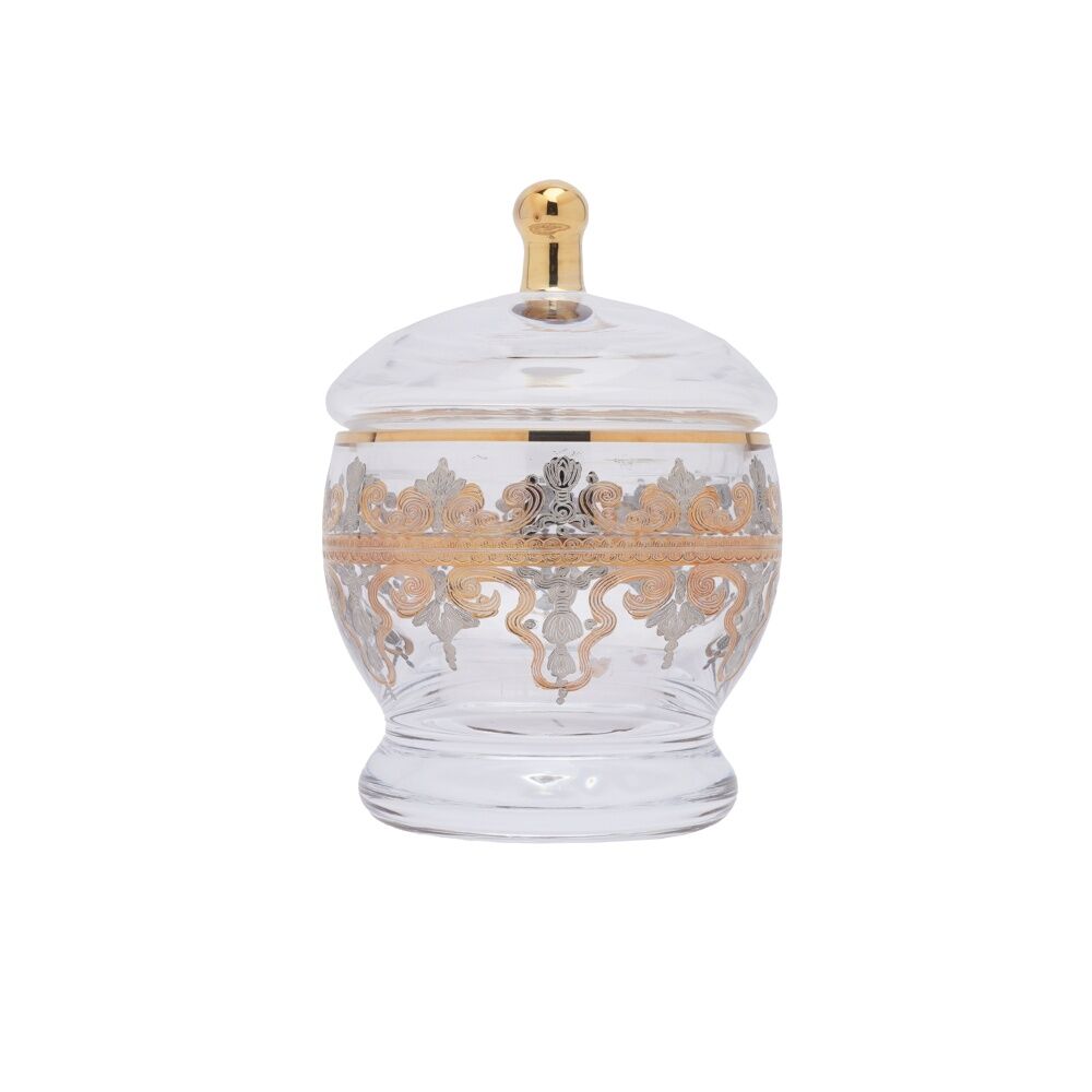سكرية مصنوعة من الزجاج مزخرفة بنقوش ذهبية وفضية, مناسبة للضيافة أو للإستخدام اليومي.