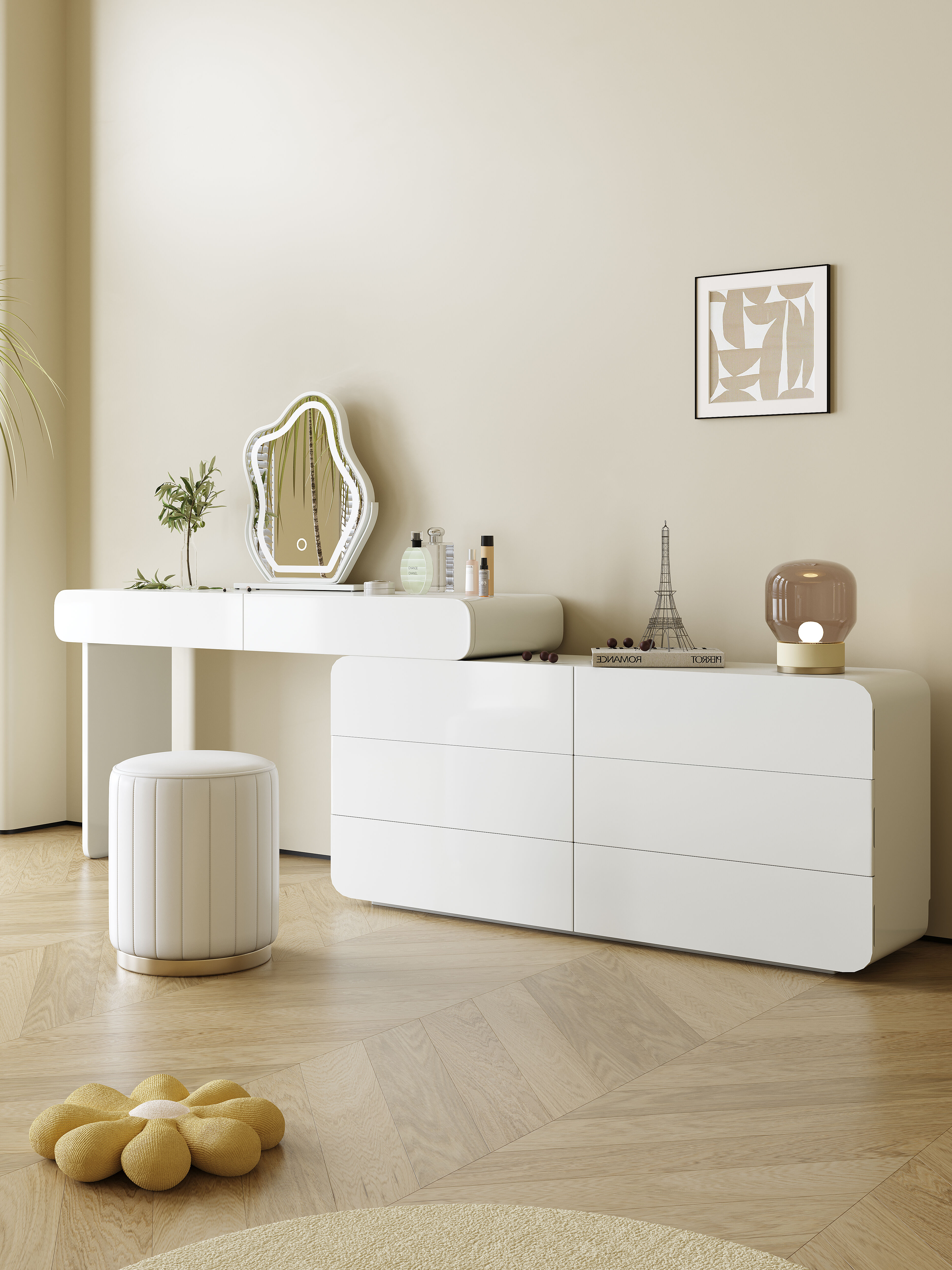 طاولة تزيين ديزني مع مرآة وكرسي - ابيض نقي تضفي الاناقة والعصرية على غرفة النوم بفضل تصميمها المميز والمودرن الذي يعكس مزيج من الأسلوب الغربي والشرقي بشكل جذاب. مصنوعة من خشب ام دي اف والخشب الصلب ب ادراج مخفية مصنوع من خشب الصنوبر الصلب حيث تزيد الطاولة فخامة بوجود مرأة جميلة ذات تصميم عصري وراقي .