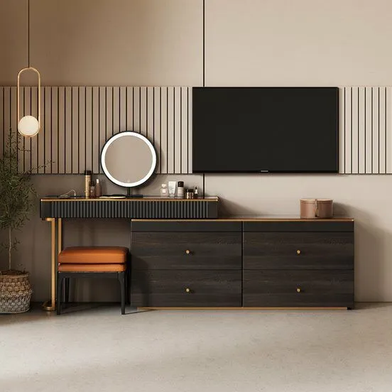 لكل امرأة تبحث عن لمسة عصرية تمزج بين الفخامة والبساطة، طاولة تزيين ساتو تأتي لتلبية احتياجاتك. بألوانها الرمادية الداكنة وتفاصيلها الذهبية، تضفي ساتو جواً من الرقي والأناقة على غرفة نومكِ، حيث تلتقي الشرق بالغرب في تصميم جذاب يعكس جمالاً لا يقاوم.