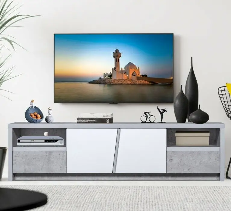 طاولة تلفزيون جيمي المصنوعة من خشب ماليزي فاخر: تحفة فنية تجمع بين الألوان الرمادية والبيضاء