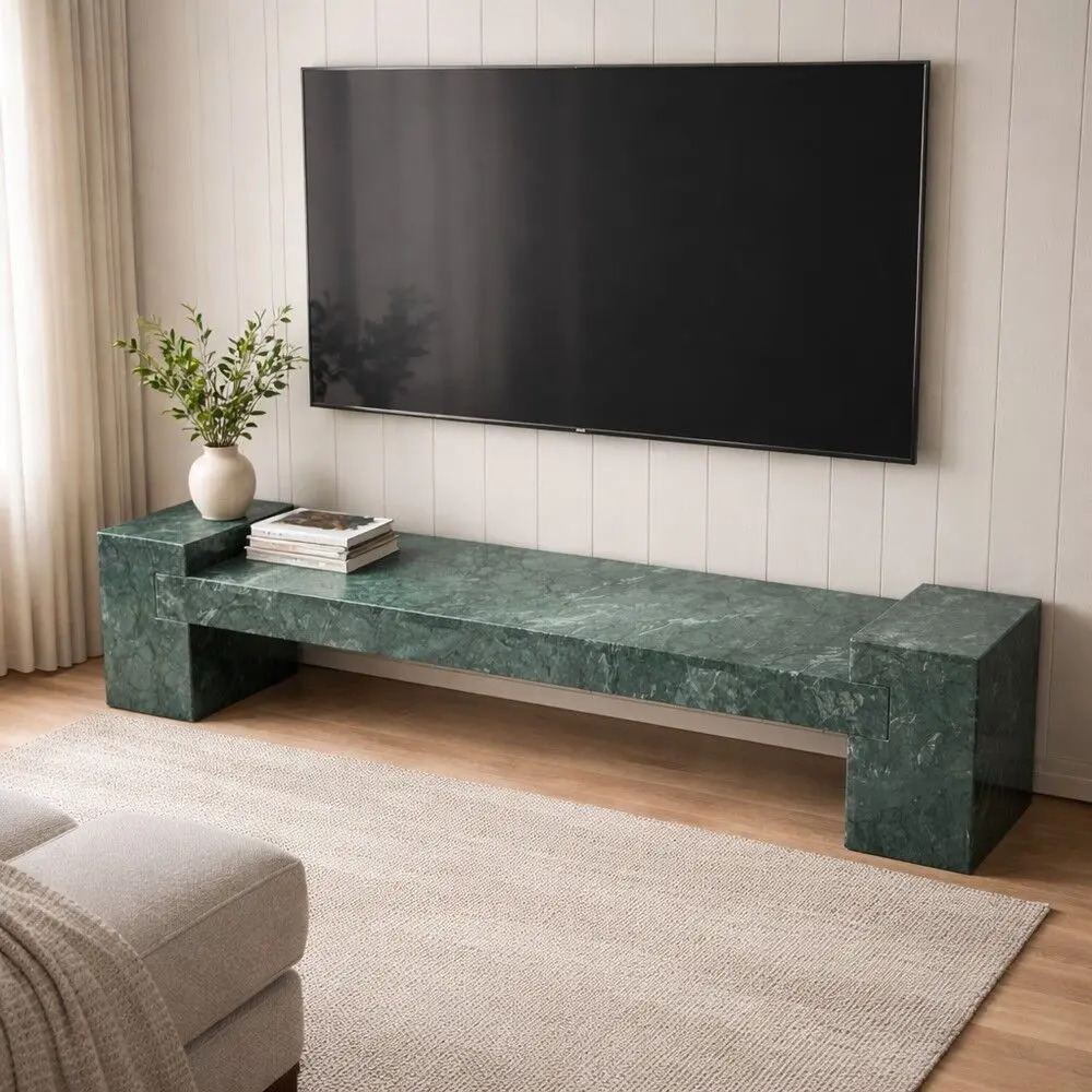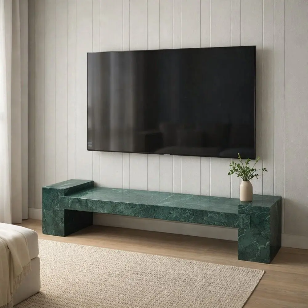 ارتقِ بمساحة المعيشة مع قطعة تجمع بين الفخامة الخالدة والطابع العصري. صُنعت هذه الطاولة من رخام طبيعي أخضر بعرقٍ فريد يمنح كل قطعة شخصية لا تتكرر، ليصبح التلفزيون محور أناقة في منزلك.