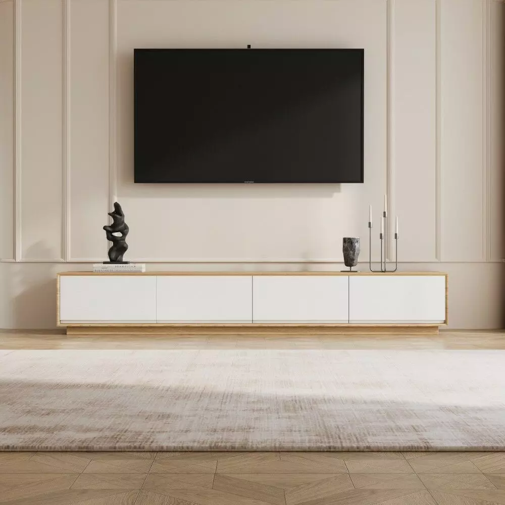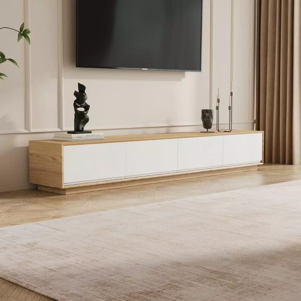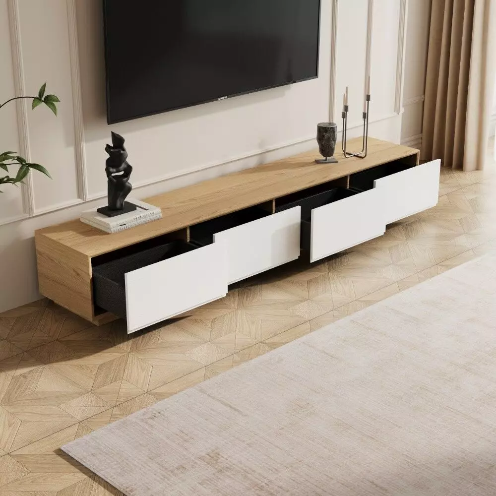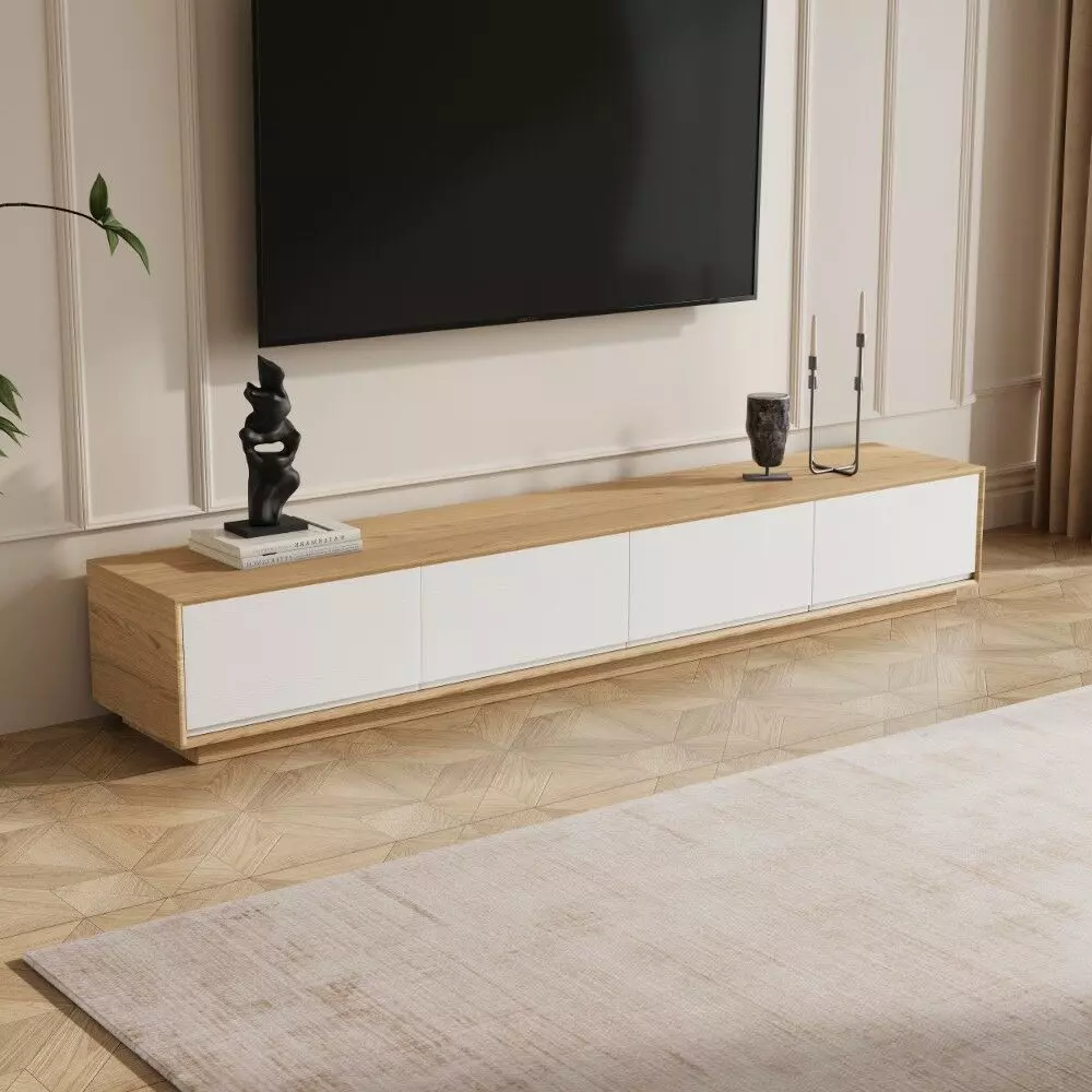 مزيج أنيق من اللون الأبيض ولون الخشب الطبيعي الفاتح يضفي إحساسًا بالدفء والفخامة، ويتناسق بسهولة مع مختلف ألوان الأثاث وديكور غرفة المعيشة.