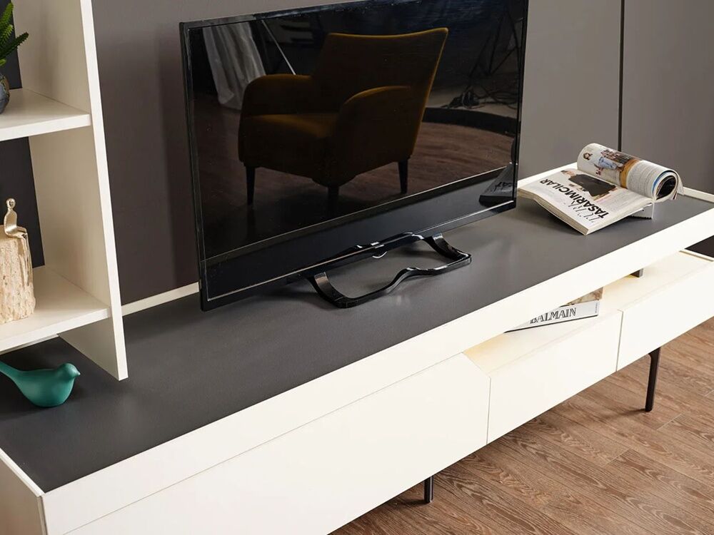تعزز الأرجل المعدنية السوداء من ثبات الطاولة، وتضيف لمسة صناعية أنيقة تواكب أحدث صيحات التصميم الداخلي. كما تضمن هذه الأرجل المتينة قدرة عالية على التحمل واستقرارًا فائقًا حتى مع الأحجام الكبيرة من الشاشات أو الأجهزة الإلكترونية.