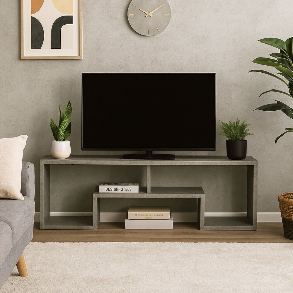 طاولة تلفزيون بتصميم عملي وأنيق، توفر سطحًا مناسبًا لوضع التلفزيون والأجهزة الإلكترونية الأخرى. تتميز بتوفير مساحة إضافية للتخزين، مما يجعلها خيارًا مثاليًا لتنظيم المساحة في غرف المعيشة أو الصالونات.