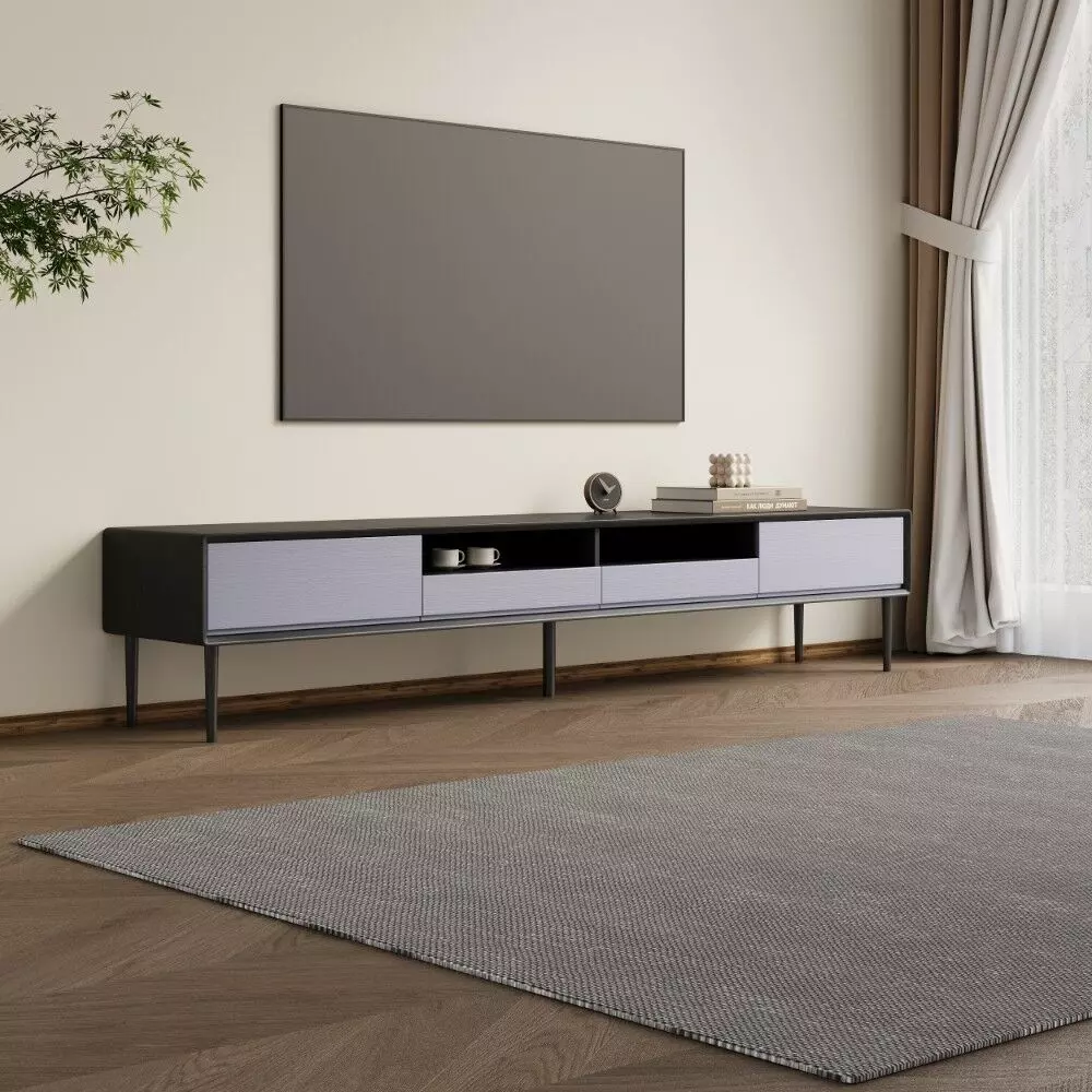 طاولة تلفزيون بتصميم عصري متوازن يجمع بين البساطة والفخامة، مع أرجل قوية وقاعدة صلبة تضمن الاستقرار وسهولة الاستخدام في أي مكان بالغرفة.