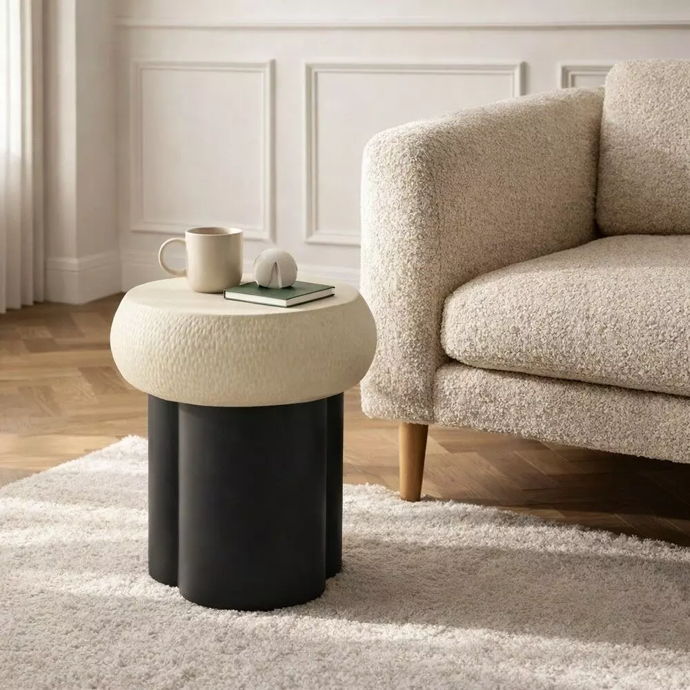 تتميّز هذه الطاولة الجانبية بتصميم عصري يجمع بين البساطة والرقي، حيث يأتي سطحها الدائري بلون أوف وايت ناعم يتناغم مع القاعدة الأسطوانية باللون الأسود، ما يمنحها حضورًا أنيقًا يكمّل ديكور غرفة المعيشة أو زاوية الجلوس بأسلوب متوازن وهادئ.