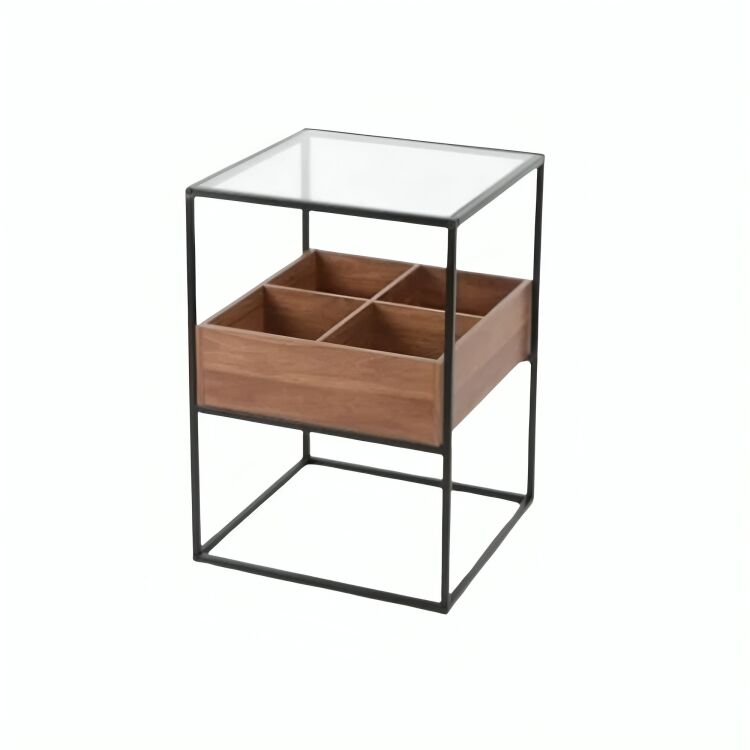 طاولة جانبية أنيقة تجمع بين الفخامة والعملية، تتميز بسطح زجاجي لامع يعكس الضوء، وصندوق خشبي عملي يوفر مساحة تخزين إضافية. القواعد المعدنية المتينة تضفي لمسة عصرية على التصميم، مما يجعلها قطعة مثالية لتكمل ديكور غرفة المعيشة أو غرفة النوم. هذه الطاولة الجانبية لا تعد مجرد قطعة أثاث، بل إضافة فنية تبرز جمال أي مساحة مع الحفاظ على الوظائف العملية.