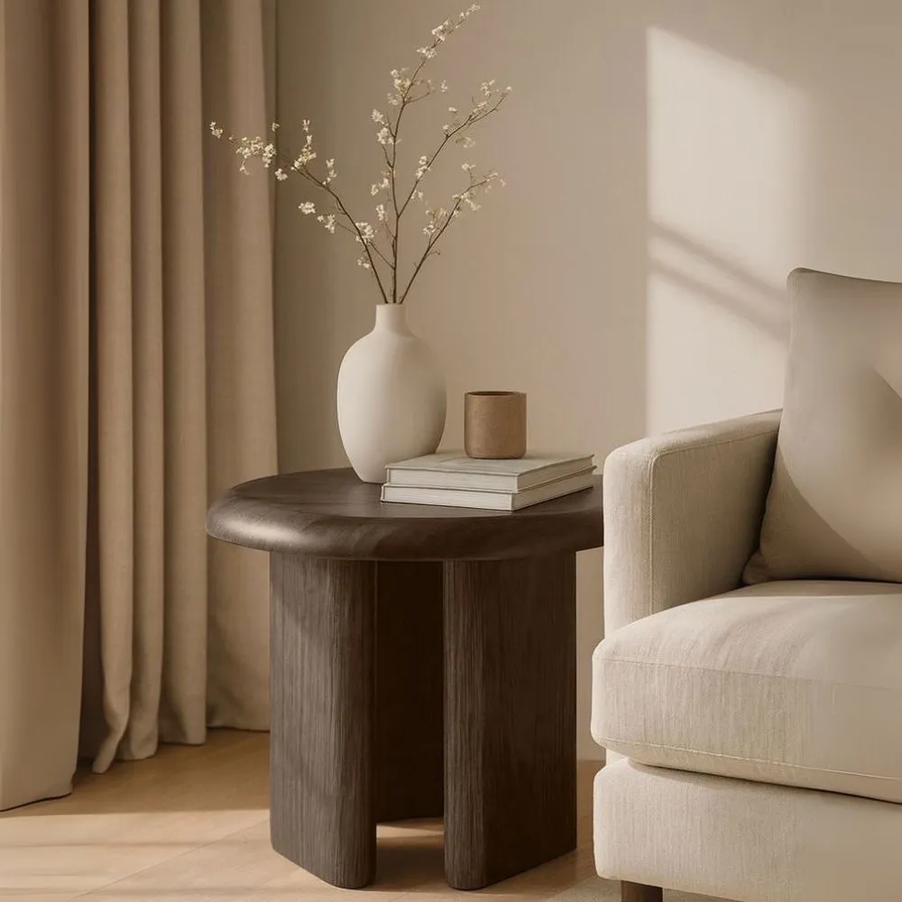 الشكل المستدير يجعلها مناسبة لمختلف المساحات، مع حواف نظيفة تمنح الطاولة مظهراً عصريًا.لون بني دافئ: