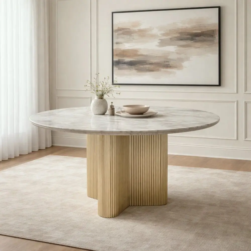 تصميم عصري بسطح دائري وحواف ناعمة، مدعوم بقاعدة مركزية مخددة تمنح ثباتًا عاليًا ومظهرًا فخمًا.عدد الأشخاص: