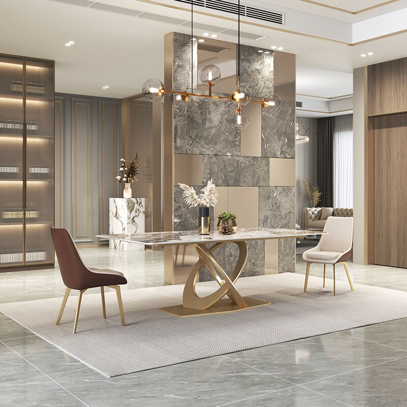 تتميز طاولة طعام مستطيلة بسطح حجري فاخر غير قابل للخدش، مما يجعلها مثالية لاستيعاب ما يصل إلى 6 أشخاص. بالإضافة إلى ذلك، فإن قاعدة الطاولة المصنوعة من الستانلس ستيل الذهبي تمنحها القوة والاستقرار، مع الحفاظ على الأناقة والجاذبية.