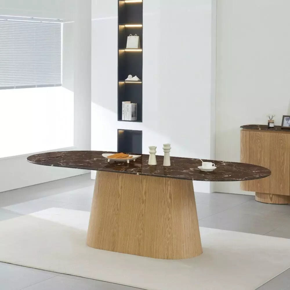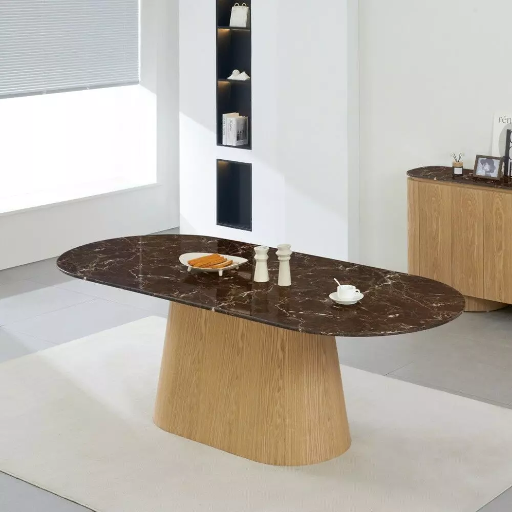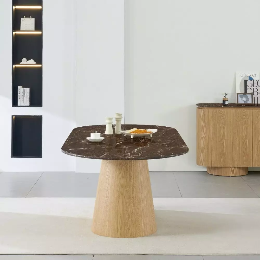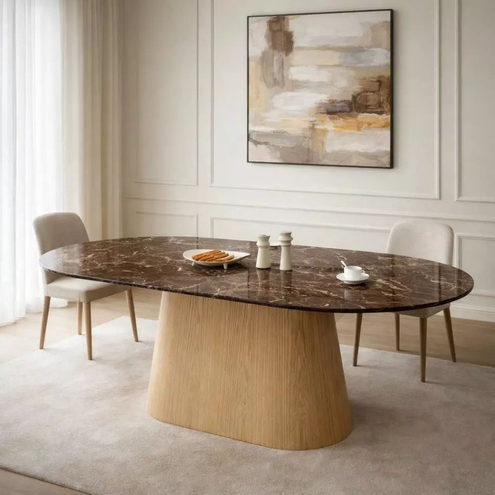 مزيج أنيق من اللون البني الغني المستوحى من جمال الرخام الطبيعي مع اللون البيج الدافئ بطابعه الخشبي الهادئ، ليمنح الطاولة مظهرًا متوازنًا يجمع بين الفخامة والدفء وينسجم بسلاسة مع مختلف أنماط الديكور.السطح: