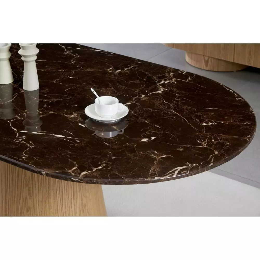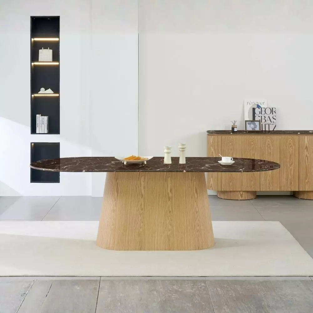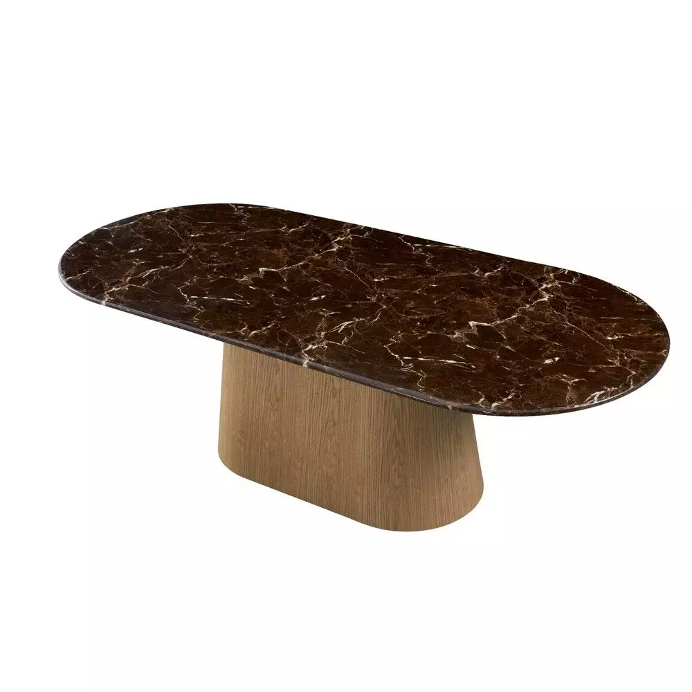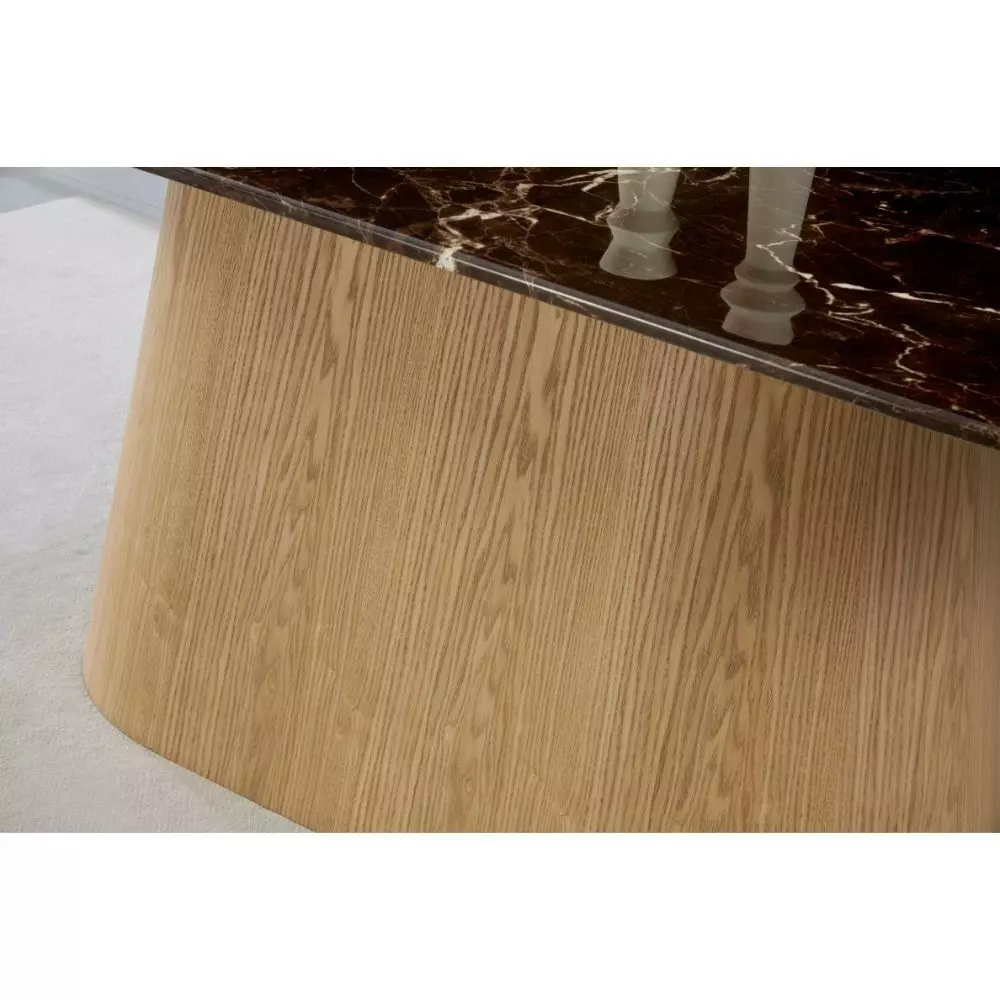 مزيج أنيق من اللون البني الغني المستوحى من جمال الرخام الطبيعي مع اللون البيج الدافئ بطابعه الخشبي الهادئ، ليمنح الطاولة مظهرًا متوازنًا يجمع بين الفخامة والدفء وينسجم بسلاسة مع مختلف أنماط الديكور.السطح: