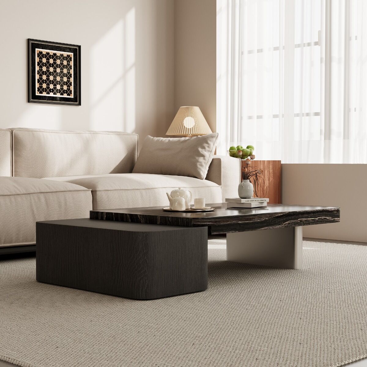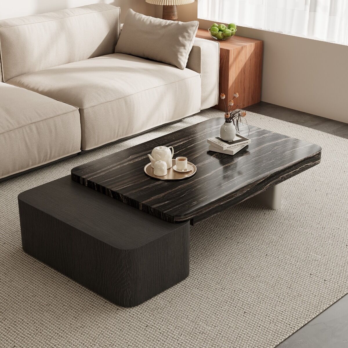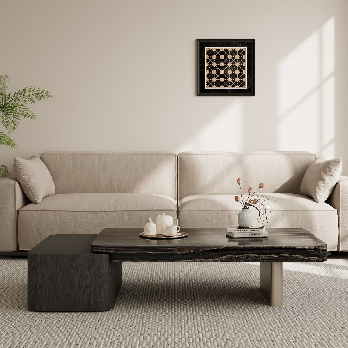 سطح بتدرجات داكنة يضفي إحساسًا بالترف والتفرّد على مساحة المعيشة.دمج خامات راقية: