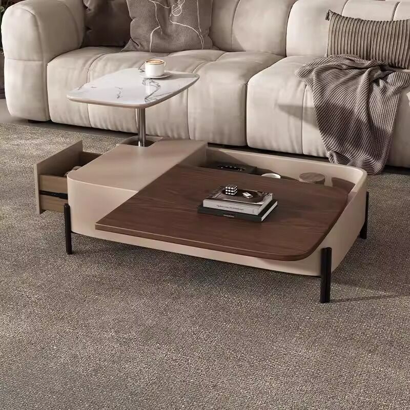 تجمع هذه الطاولة بين التصميم العصري والوظائف العملية لتوفير مساحة تخزين إضافية وتحسين استخدام المساحة بشكل ذكي.