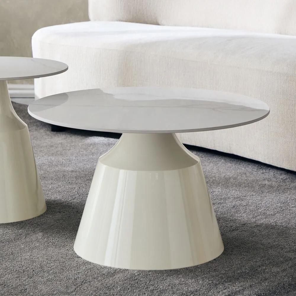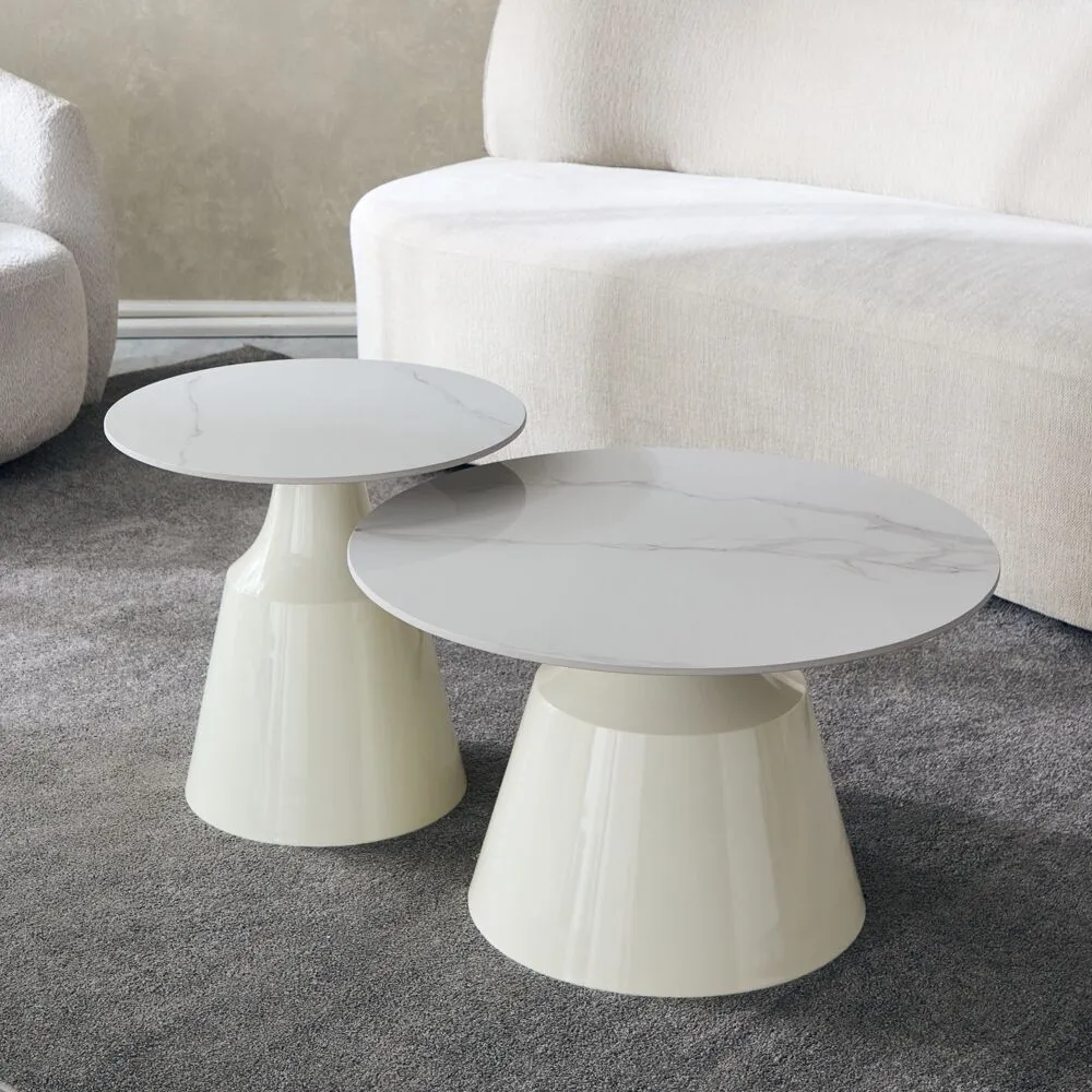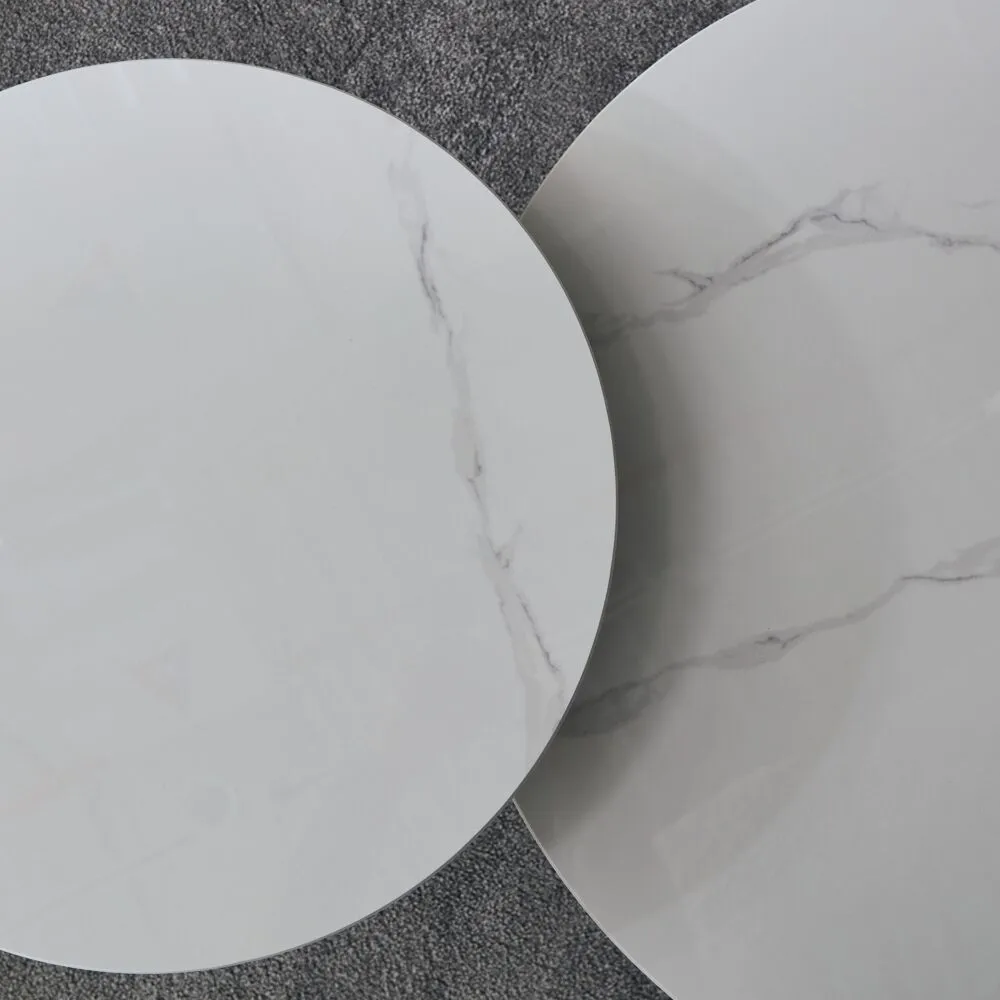 طاولة 1 القُطر: 70 سم x الوزن: 9.5 كجم x الارتفاع: 43 سم طاولة 2 القُطر: 50 سم x الوزن: 9.5 كجم x الارتفاع: 47.5 سم |