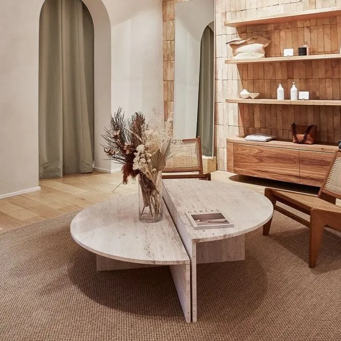 طاولة قهوة من رخام ترافنتينو طاولة نصفين بتصميم مبتكر من رخام الترافنتينو, تشكل إضافة عملية بلمسة من الفخامة إلى أثاث غرفة المعيشة الخاصة بك.