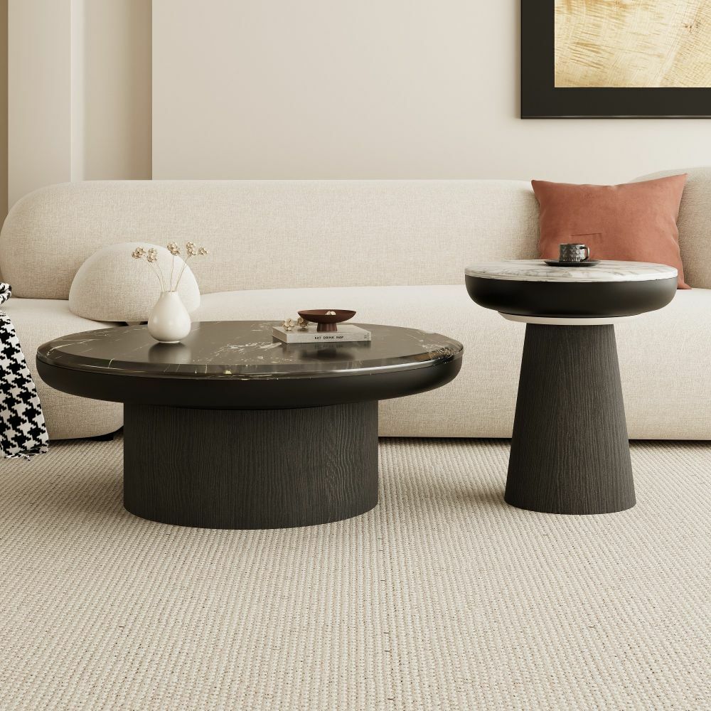 طاولتان بتصميمين مختلفين في الارتفاع، تضيفان بعدًا بصريًا مميزًا وتجعل الطقم مناسبًا للاستخدام العملي والديكوري.سطح من الرخام الفاخر: