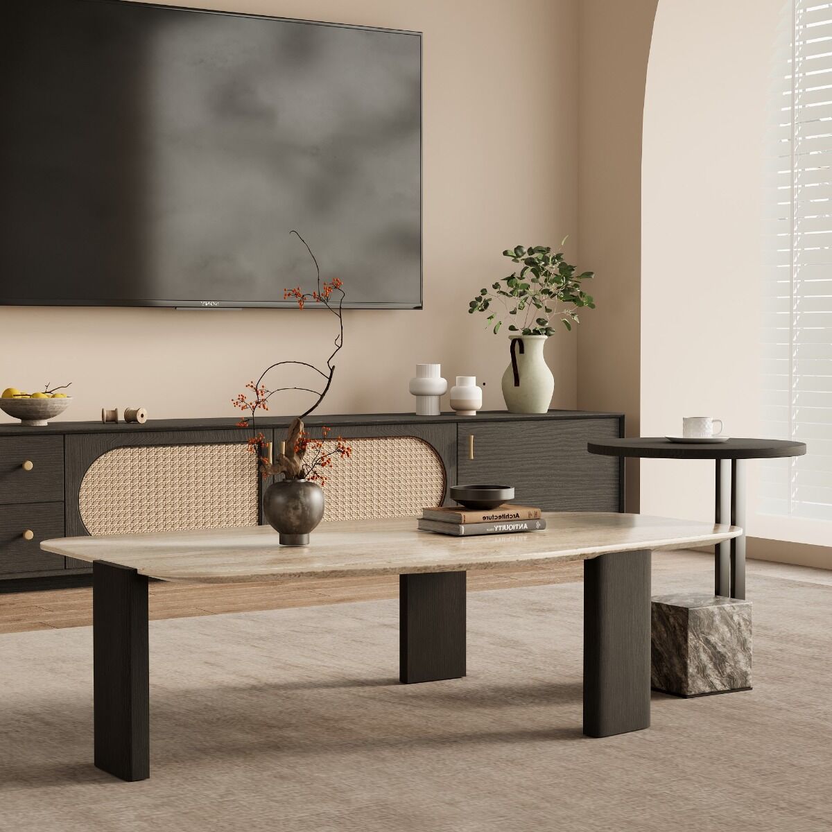 طاولة قهوة عصرية بتصميم فاخر ومميز مع طاولة جانبية، تجمع بين البساطة والأناقة لتناسب جميع أنواع الديكورات الداخلية، سواء كانت عصرية، كلاسيكية أو مزيج من الاثنين. تتميز هذه الطاولة بتناسق فريد بين الأشكال الهندسية المختلفة، لتضيف لمسة راقية لأي غرفة معيشة أو صالة استقبال.