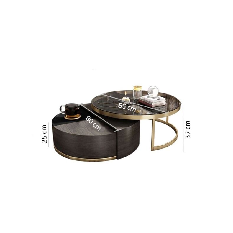 كما أن طقم طاولتين موديرن اليغانس هو عبارة عن طاولتين يمكن نقل كل منهما على حدة، الطاولة الأولى هى مُكونة من الخشب باللون الأسود وتحتوي على العديد من الأدراج لتفادي أي حالة من عدم النظام فى المكان. والطاولة الأخري هى عبارة عن طاولة بسطح زجاجي وأرجل من المعدن باللون الذهبي.
