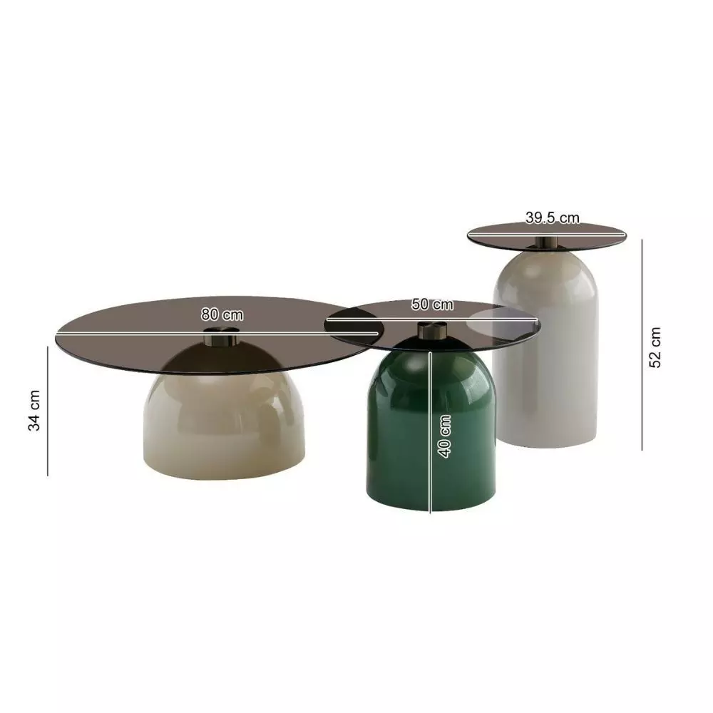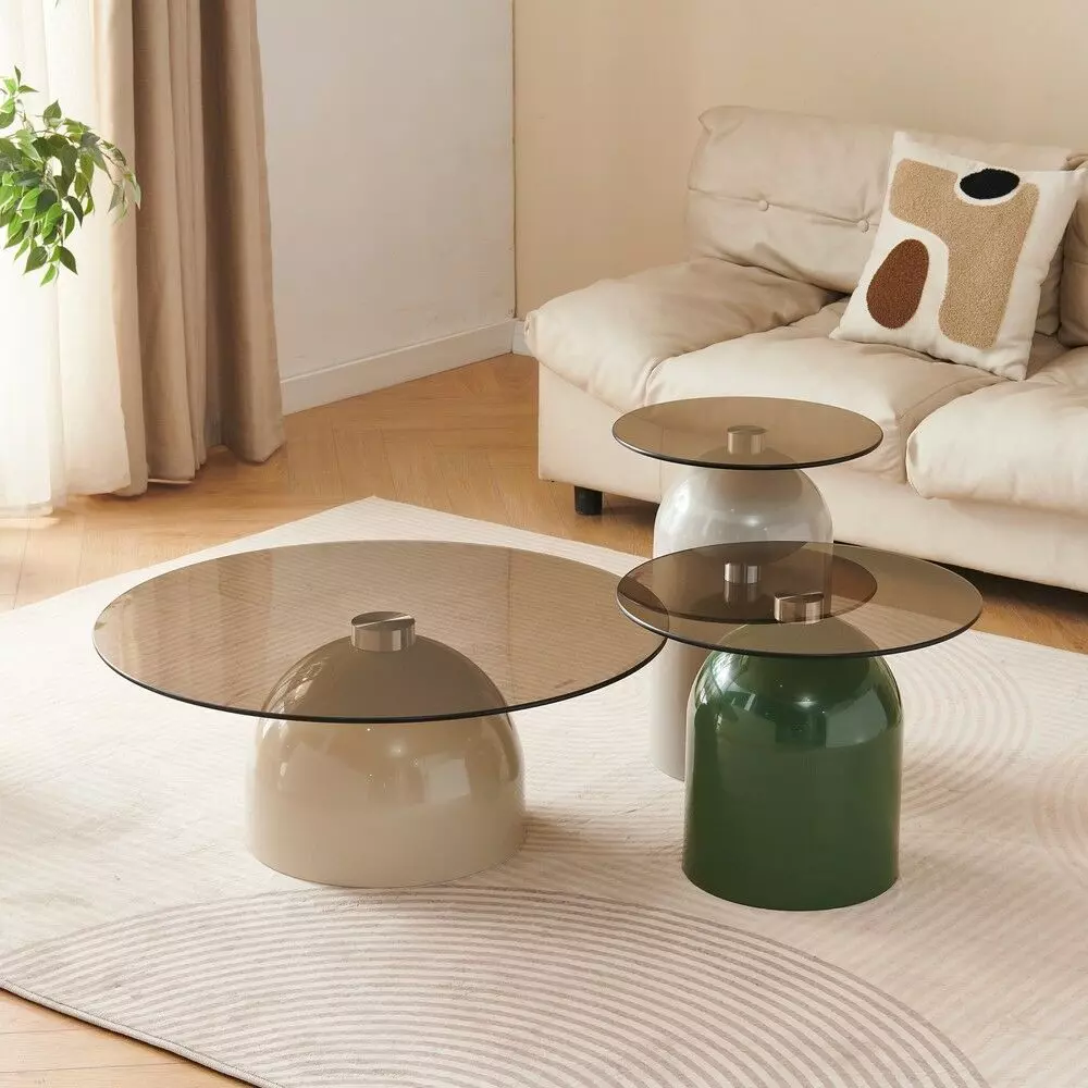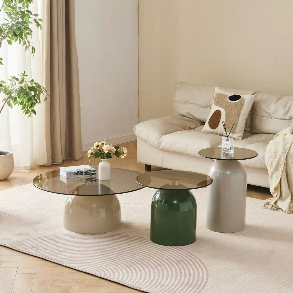 ألوان عصرية وجذابة : قاعدة طاولة القهوة باللون البيج الهادئ والطاولة الجانبية المرتفعة بلون رمادي جذاب والأقل ارتفاعا بلون أخضر عصري يجذب الأنظار.