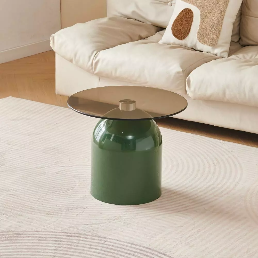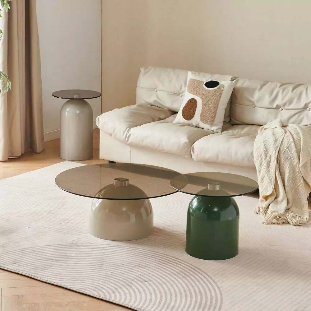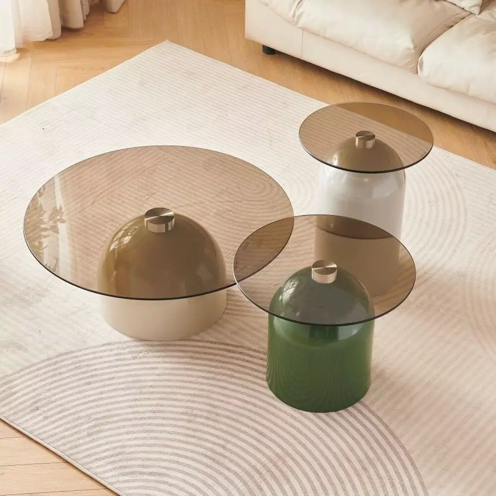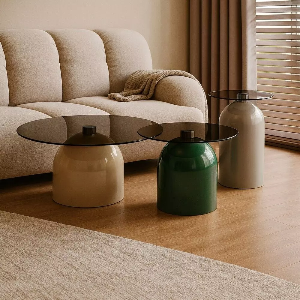 ألوان عصرية وجذابة : قاعدة طاولة القهوة باللون البيج الهادئ والطاولة الجانبية المرتفعة بلون رمادي جذاب والأقل ارتفاعا بلون أخضر عصري يجذب الأنظار.