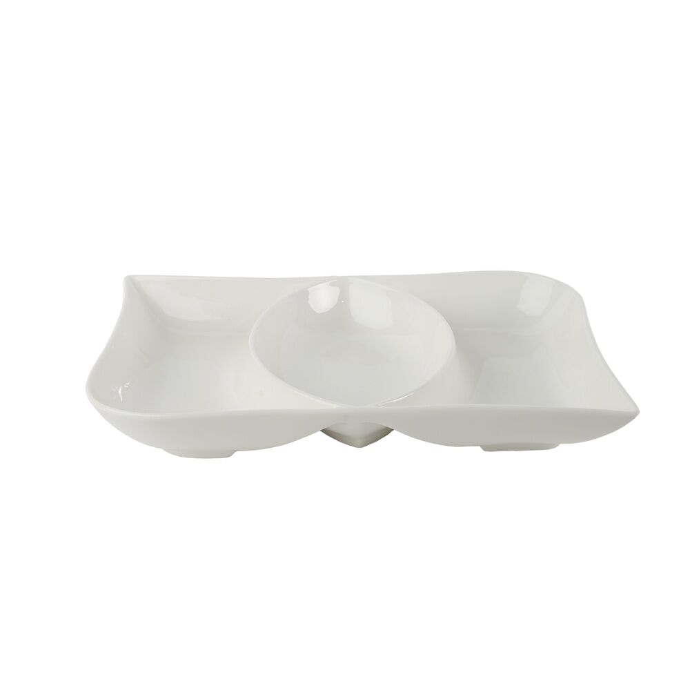 طبق مستطيل الشكل مقسم إلى 3 أقسام مصنوع من البورسلان باللون الأبيض, مناسب لإحتواء مختلف الأصناف وإختيار مثالي لتقديم وتنسيق الأطعمة بشكل جميل ومنظم.