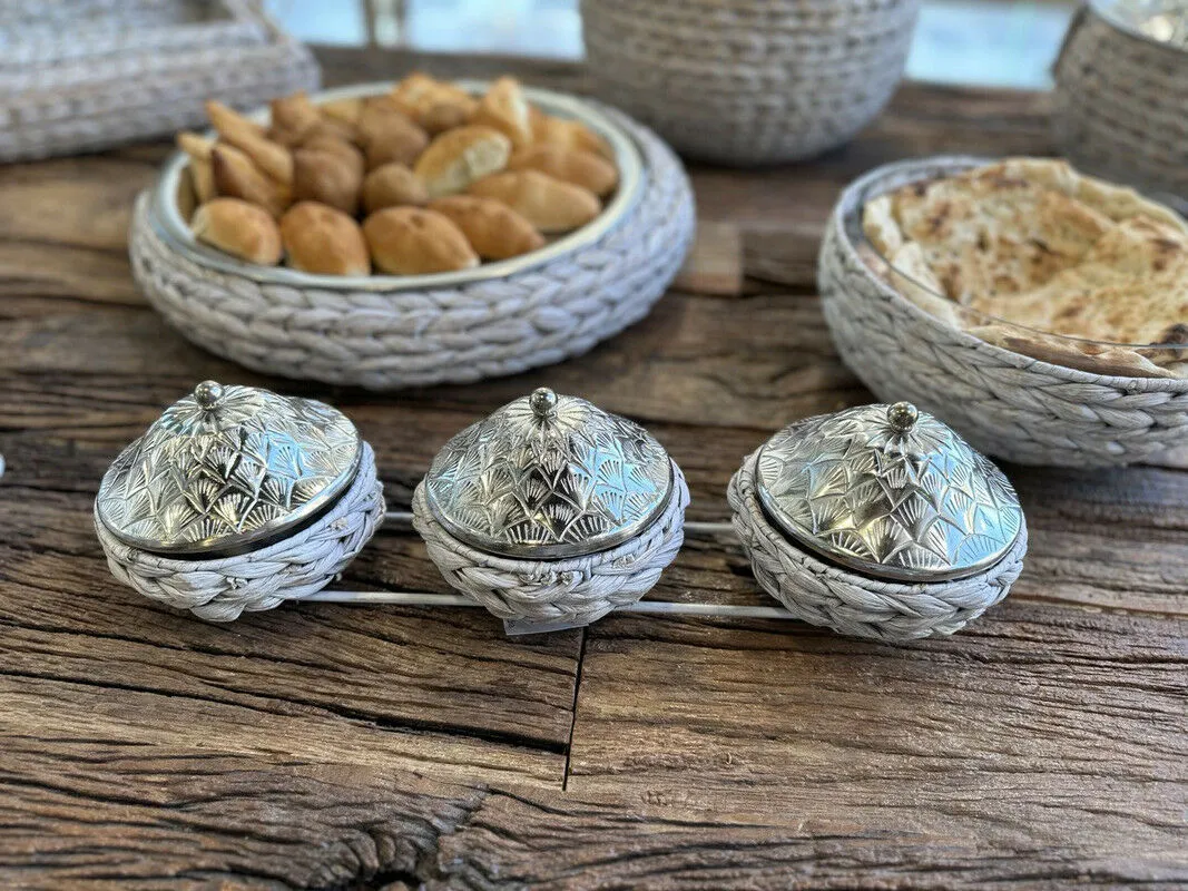 عززي أناقة مستلزمات المائدة لديكِ باقتناء طقم تقديم من 3 زبديات من مجموعة غراس الحصرية ، حيث صنعت يدويا من عشب البحر ،غطاء من معدن الألمنيوم بنقش رائع وراقي. صنع يدويا من أمهر الأيادي الحرفية.