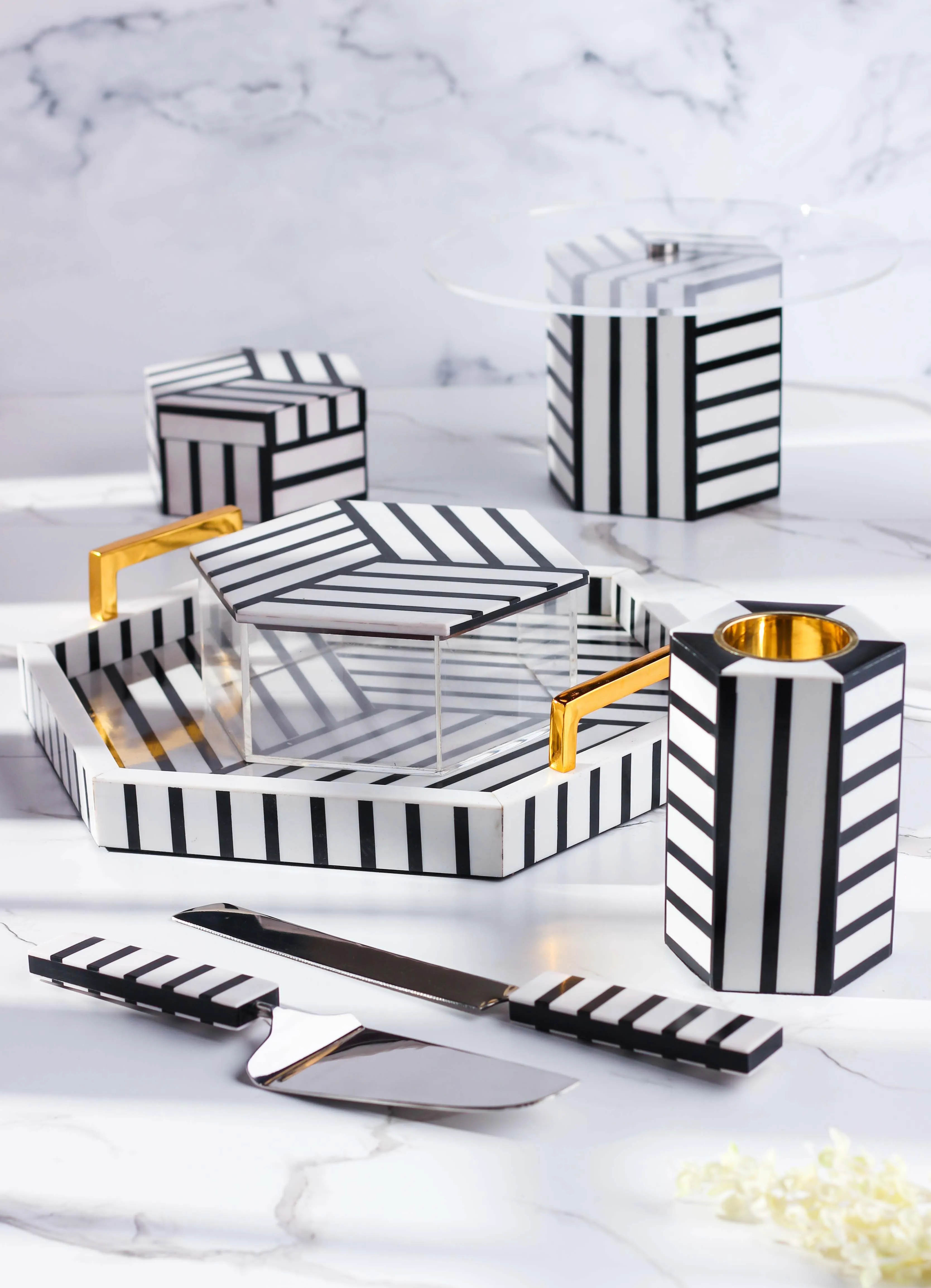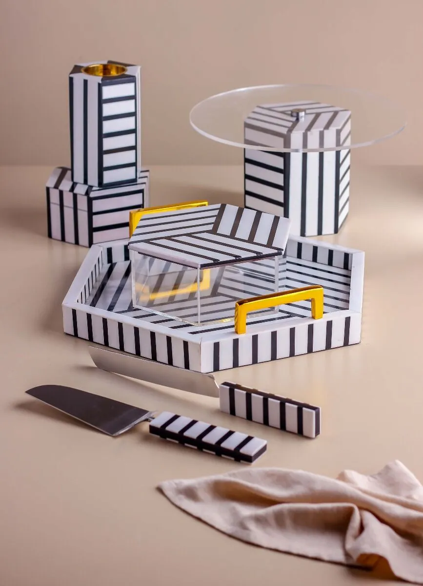 | يتضمن الطقم | صينية وصندوق تقديم وحامل كيك مع سكين وملعقة لحمل الكيك ومبخرة وصندوق للبخور |
