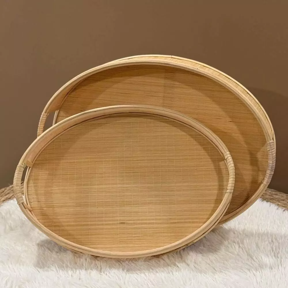طقم صينية تقديم راتان خشب بيضاوية قطعتين – صناعة يدوية أضيفي لمسة طبيعية أنيقة إلى منزلك مع طقم صينية التقديم المصنوعة يدويًا من الخشب والراتان الطبيعي. تصميم بيضاوي بستايل بوهيمي دافئ يناسب الضيافة اليومية، القهوة العربية، الحلويات، أو كقطعة ديكور مميزة على الطاولة أو الكونسول.