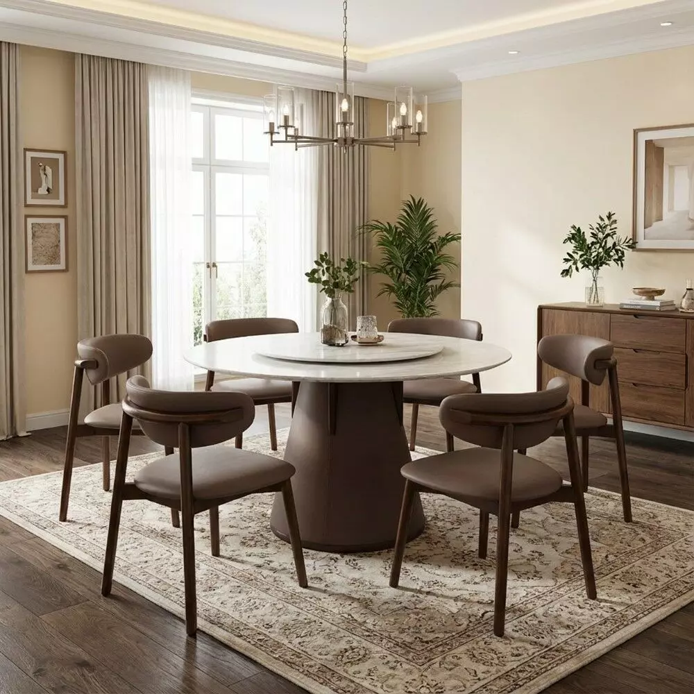 طقم طاولة طعام هافن لستة أشخاص باللون الرمادي يتميز بتصميم أنيق يجمع بين سطح رخام فاخر وقاعدة خشبية متينة، مع كراسٍ مكسوة بجلد عالي الجودة توفر الراحة والأناقة، ليشكل خياراً مثالياً ينسجم مع مختلف أنماط الديكور الداخلي ويضفي لمسة عصرية على غرفة الطعام.