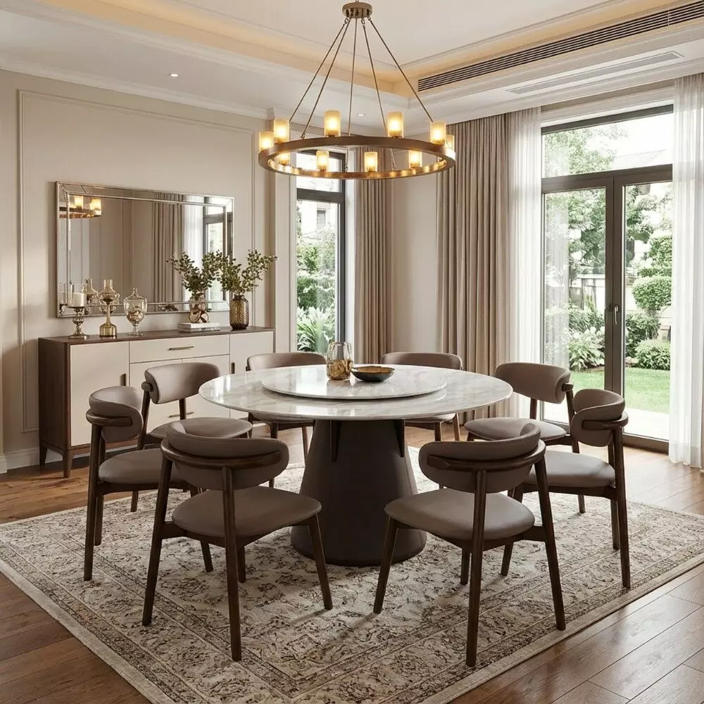 طقم طاولة طعام هافن لثمانية أشخاص باللون الرمادي يتميز بتصميم أنيق يجمع بين سطح رخام فاخر وقاعدة خشبية متينة، مع كراسٍ مكسوة بجلد عالي الجودة توفر الراحة والأناقة، ليكون خياراً مثالياً ينسجم مع مختلف أنماط الديكور الداخلي ويضيف لمسة عصرية راقية لغرفة الطعام.