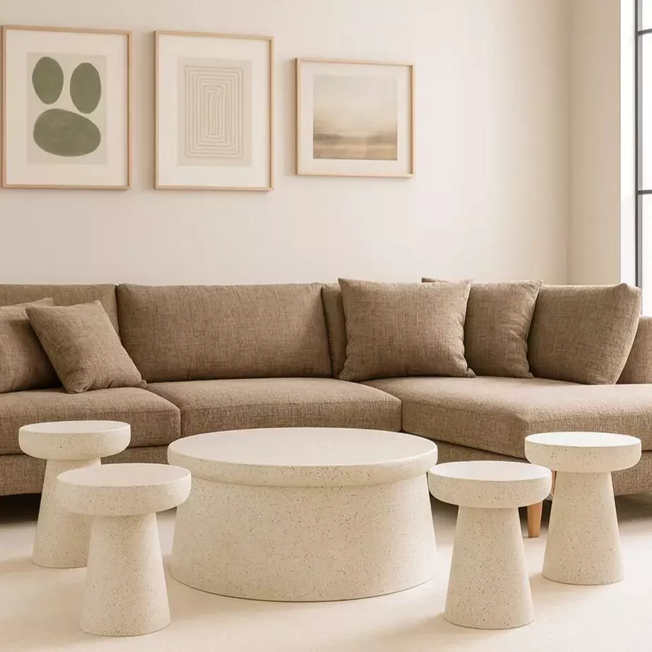 طقم مكون من 5 قطع يشمل طاولة قهوة وطاولات جانبية بتصميم متناسق وأنيق، مثالي لإكمال ديكور غرفة المعيشة مع توفير مساحات إضافية لوضع المشروبات أو الديكورات.