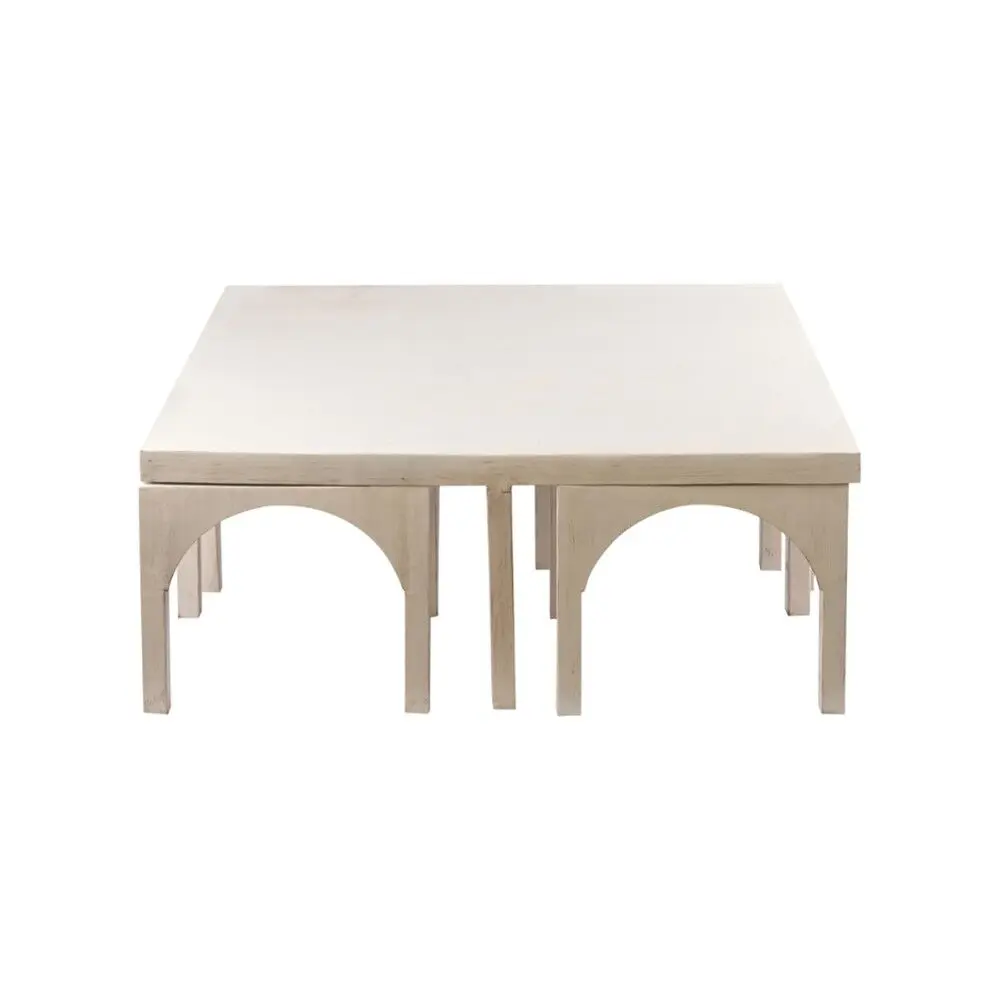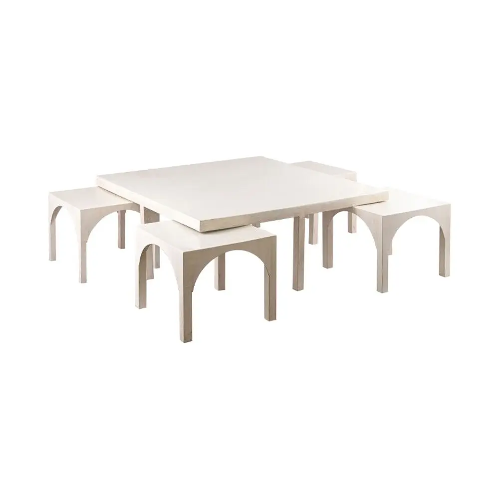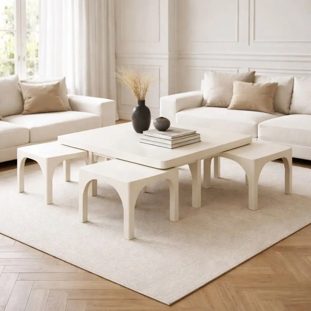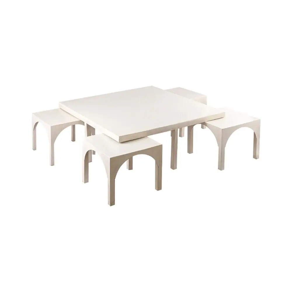 تتكوّن هذه المجموعة من طاولة قهوة مركزية مع أربع طاولات جانبية بتصميم عصري أنيق يجمع بين الجمال والعملية. تتميّز بتناسقها المثالي وإمكانية ترتيب الطاولات الجانبية أسفل طاولة القهوة، ما يوفّر المساحة ويمنح المكان مظهرًا مرتبًا وأنيقًا يناسب مختلف أنماط الديكور الداخلي.