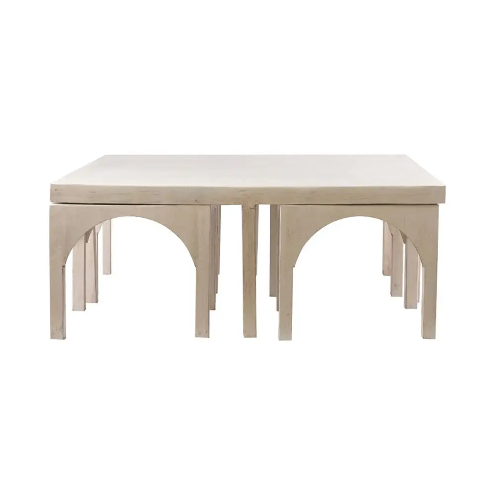 تتميّز المجموعة بتصميم عصري بخطوط ناعمة وحواف انسيابية، مع تناغم متكامل بين طاولة القهوة والطاولات الجانبية، ما يوفّر مظهرًا أنيقًا وعمليًا مع إمكانية ترتيب القطع أسفل الطاولة لتوفير المساحة.