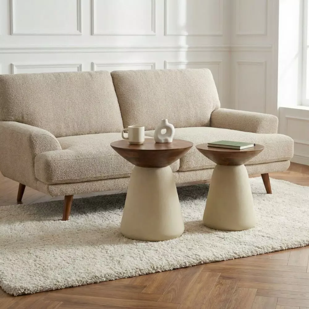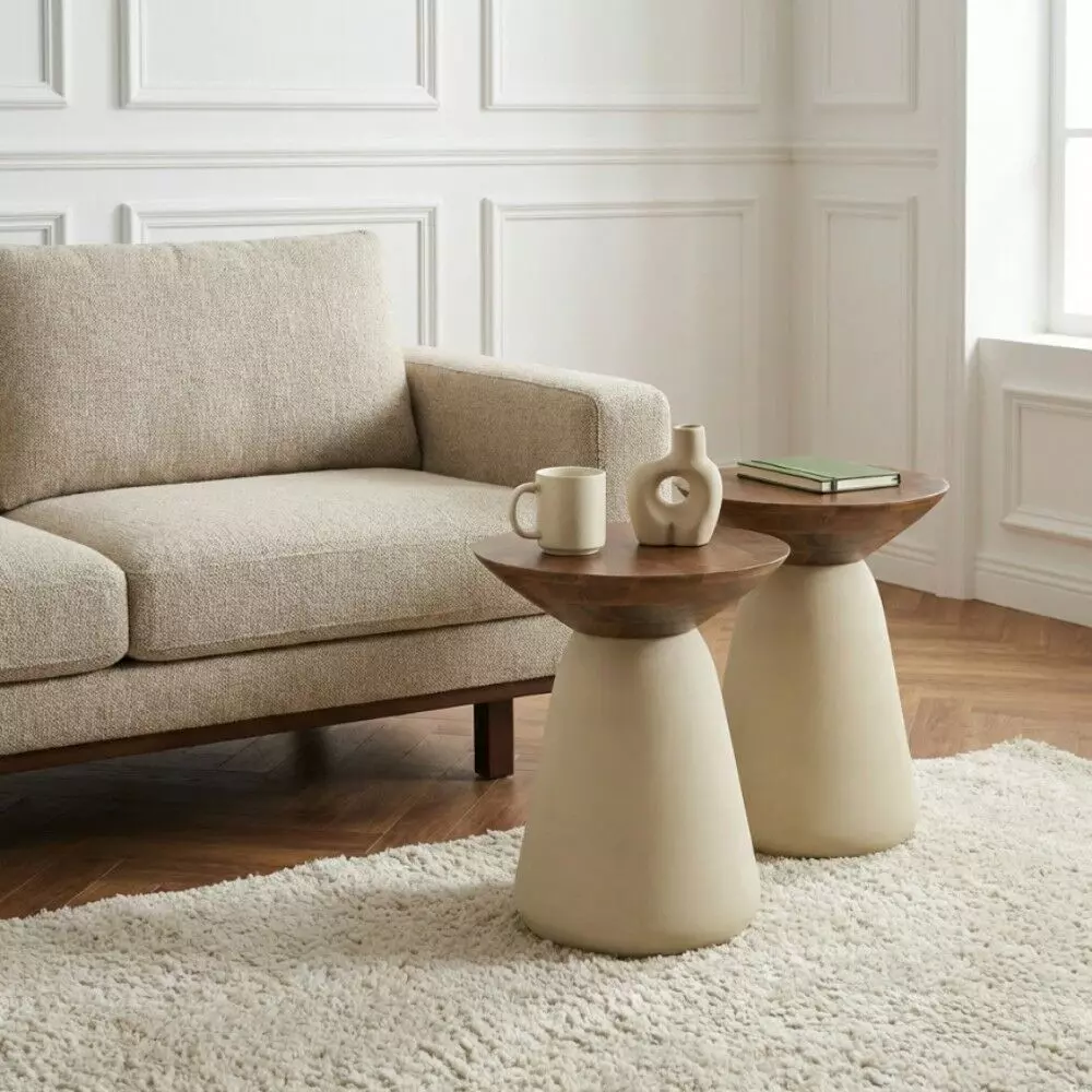 تصميم عصري بسطح دائري وحواف ناعمة مع قاعدة مخروطية متوازنة، يمنح الطاولتين مظهرًا أنيقًا ولمسة طبيعية راقية.