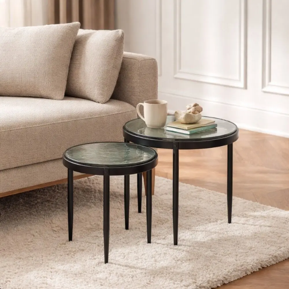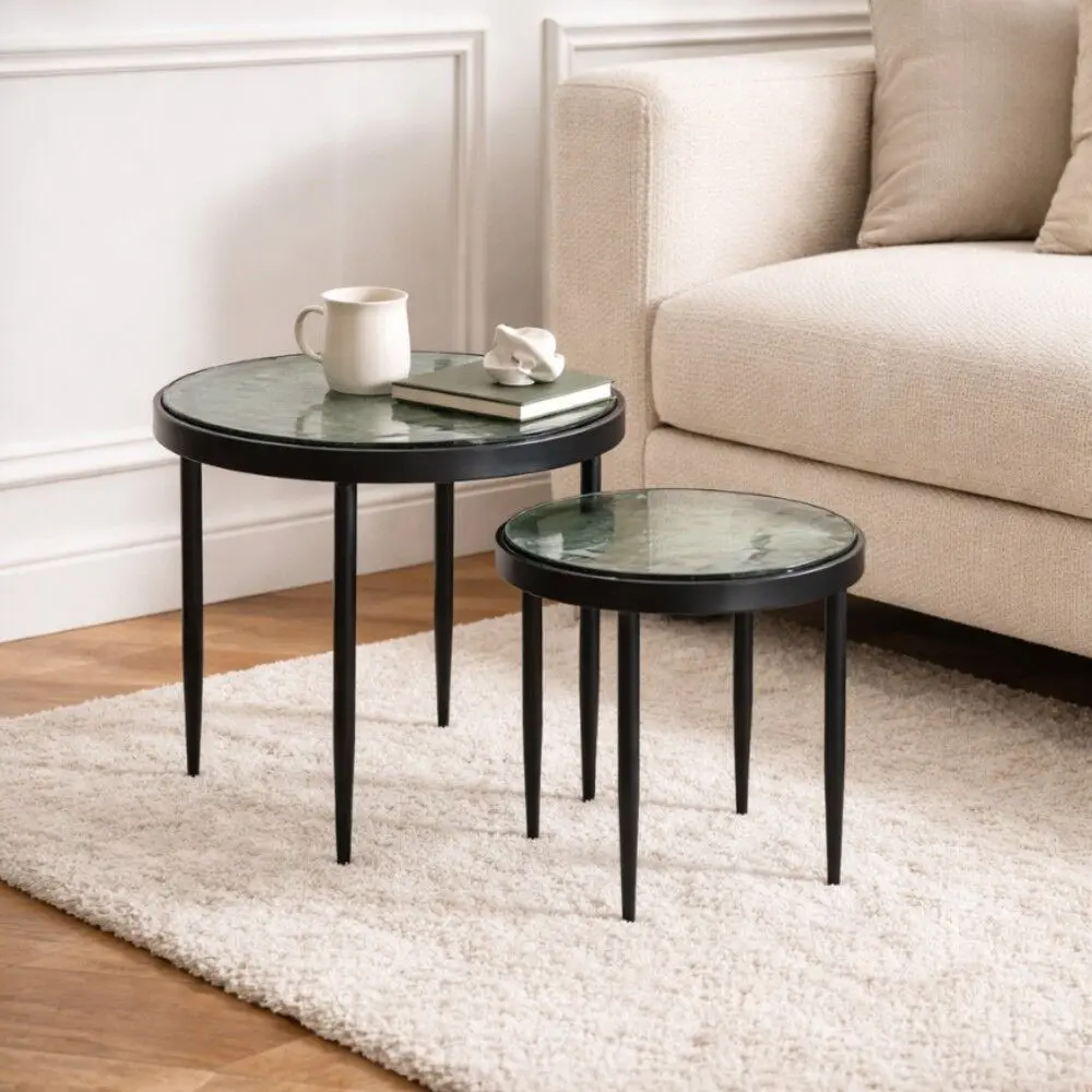 تصميم عصري بسطح دائري وأرجل معدنية رفيعة تمنح الطاولتين مظهرًا خفيفًا وتوازنًا أنيقًا.اشتري الآن من بيتونيا وتمتعي بجودة استثنائية وتصاميم مميزة تكمّل جمال منزلك.