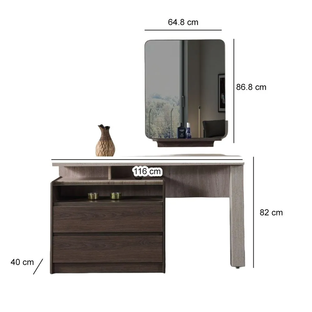 سرير : عرض 190- عمق 210 - ارتفاع 125 سم كومودينو : عرض 60 - عمق 40 - ارتفاع 44 سم طاولة تزيين : عرض 116 - عمق 40 - ارتفاع 82 سم مرآة : عرض 64.8 - ارتفاع 86.8 سم |