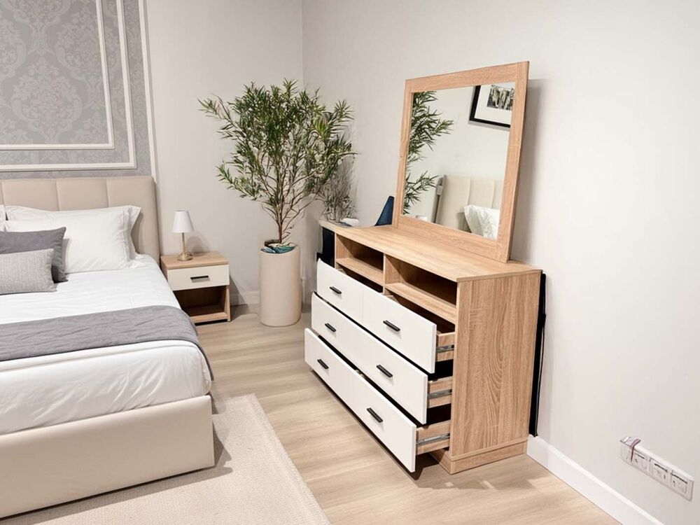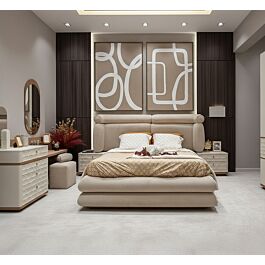 طقم غرفة نوم بتصميم عصري يجمع بين الأناقة والراحة ليمنح غرفتك لمسة فاخرة, يتميز بتفاصيل دقيقة تشع فخامة وتكمل ديكور الغرفة بانسجام تام. مصنوع من مواد عالية الجودة لضمان المتانة وطول العمر وألوانه الهادئة تضفي أجواء مريحة ومفعمة بالدفء.
