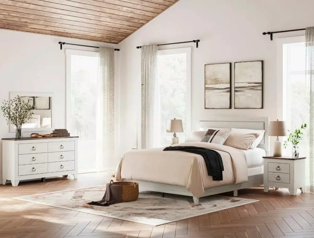 يتضمن الطقم 1 سرير 1 طاولة تزيين 1 مرآة 2 كومودينو 1 قاعدة سرير فقط