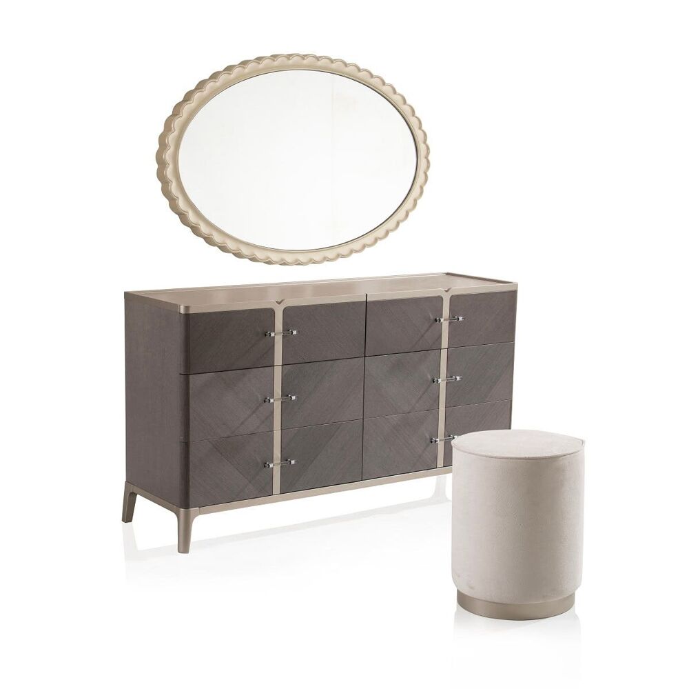 | يتضمن الطقم | سرير 1 قطعة - كمودينو 2 قطعة - تسريحة 1 قطعة - مراية حائط 1 قطعة - كرسي تسريحة 1 قطعة |