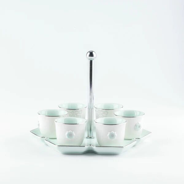 تمتعي بضيافة استثنائية مع هذا الطقم الذي يحتوي على 6 فناجين قهوة متوسطة الحجم، بتصميم كلاسيكي يشبه الأكواب التقليدية، الفناجين مزودة ببعض الزخارف في أحد الجوانب، مع وجود وردة بارزة على الجانب الآخر وستاند قابل للفك والتركيب ومزود بيد باللون الذهبي، مع وجود كرة في مؤخرة اليد حتى يسهل حمل الطاقم بها، ستاند على شكل وردة منسقة يحتوي على 6 أماكن فارغة من أجل تنسيق الفناجين بها.